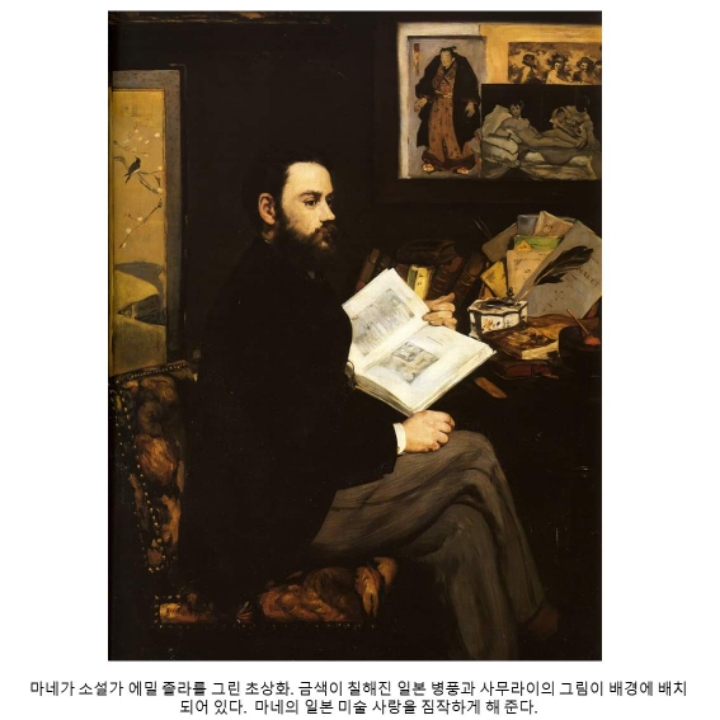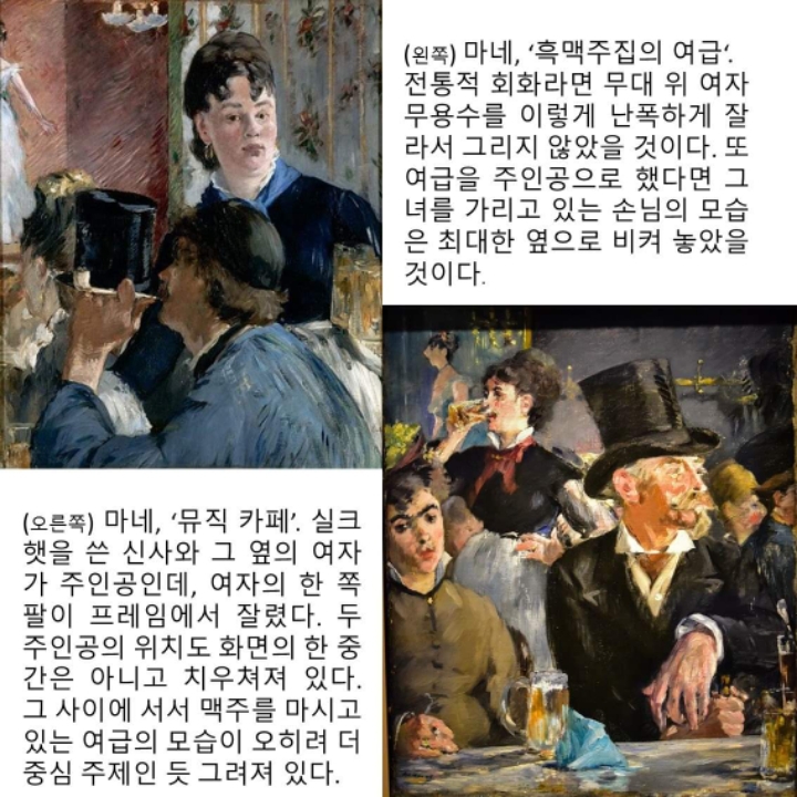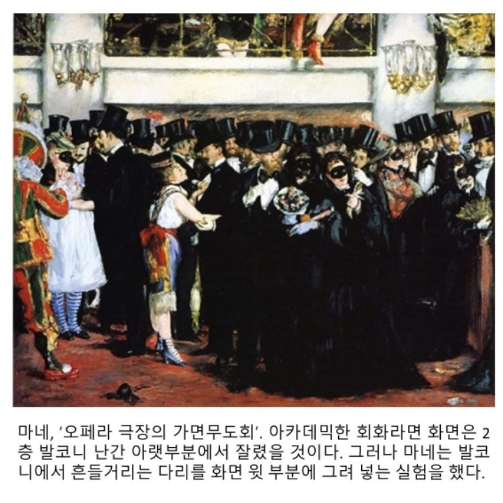 그림의 주제를 가리는 장애물을 화면의 전경에 배치하는 것, 또는 그림의 주제를 화면 중심에 놓지 않고 프레임에서 절단하는 것, 이런 우키요에의 기법에 마네는 매료되었다.