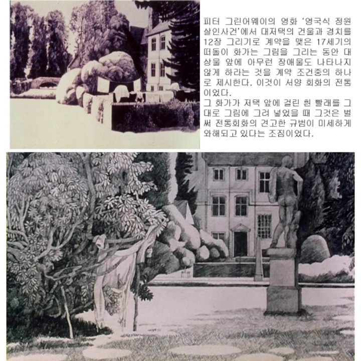 피터 그린어웨이의 영화 ‘영국식 정원 살인사건’에서 대저택의 건물과 경치를 12장 그리기로 계약을 맺은 17세기의 떠돌이 화가는 그림을 그리는 동안 대상물 앞에 아무런 장애물도 나타나지 않게 하라는 것을 계약 조건중의 하나로 제시한다. 이것이 서양 회화의 전통이었다. 그런데 화가가 저택 앞에 걸린 흰 빨래를 그대로 그림에 그려 넣었을 때, 그것은 벌써 전통회화의 견고한 규범이 미세하게 와해되고 있다는 조짐이었다.