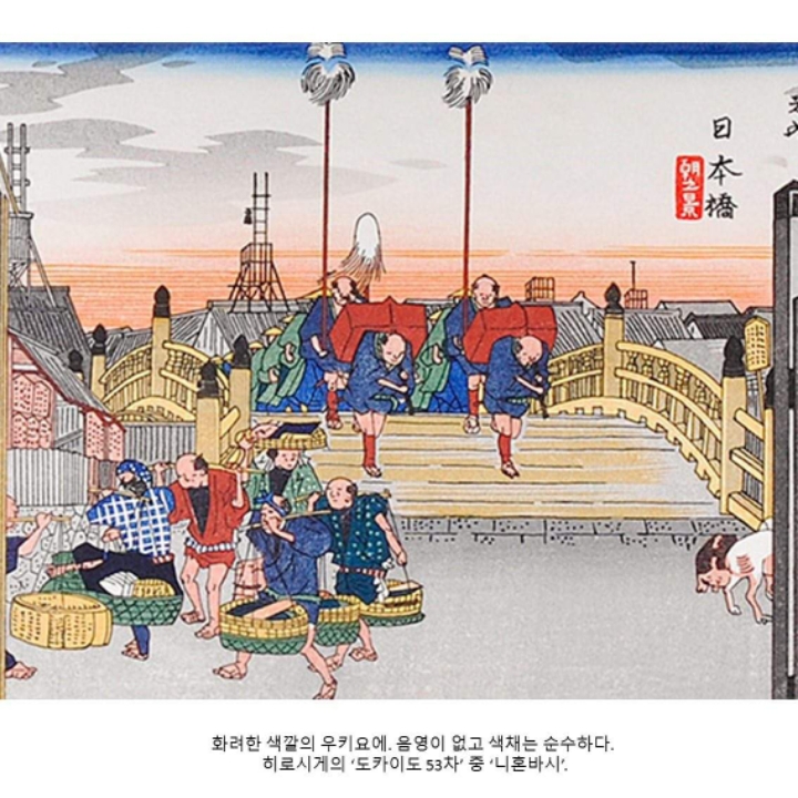 19세기 유럽의 화가들이 놀라운 눈빛으로 우키요에를 본 것은 우선 그 화려한 색깔 때문이었다. 히로시게의 그림에서 강물은 코발트를 풀어놓은 듯 투명한 푸른색이고 물위의 정자(亭子)는 순수한 빨간색이다. 이때까지 어두컴컴한 화면에만 익숙해 있던 유럽의 화가들은 전통 회화 속 세계와는 달리 실제 세상은 달콤하고 화사한 색채로 되어 있다는 것을 새삼 깨달았다. 그리고 야외로 나가 빛의 움직임에 따라 변하는 사물의 느낌과 색깔을 관찰하기 시작했다. 반 고흐의 화사한 색깔, 시시각각 변하는 빛에 따라 다채롭게 변하는 모네의 수련 그림들이 모두 우키요에의 영향을 받은 것이다. 세잔이 생트 빅투아르 산에 매일 나가 관찰하면서 수 십 점의 산 그림을 남긴 것도 호쿠사이의 후지산 그림 창작 과정에서 영감을 얻은 것이다.