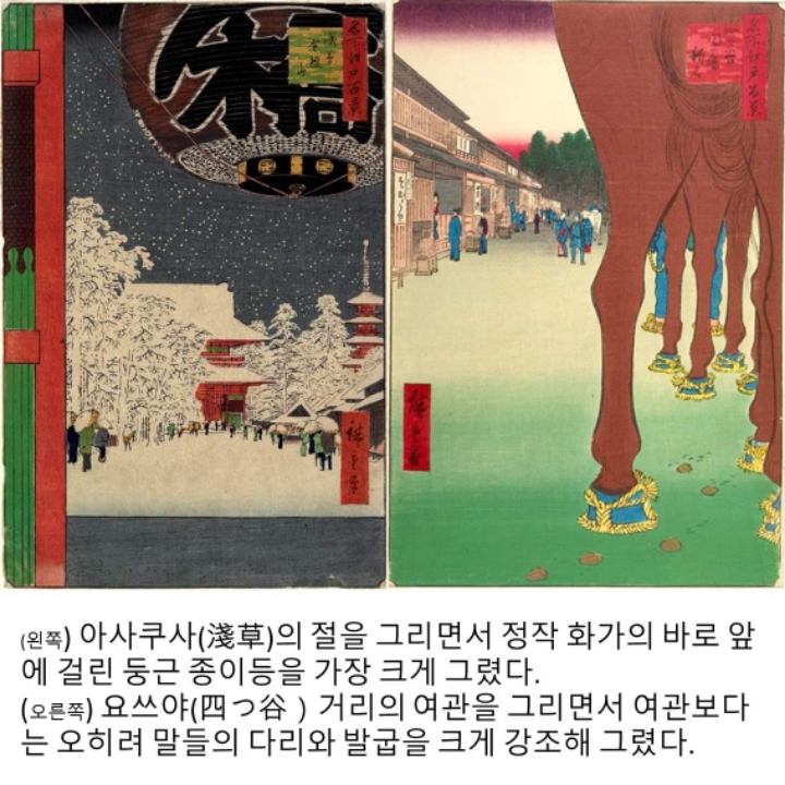 강과 산의 풍경을 그리면서 화가의 바로 옆에 있는 벗 꽃 나무를 마치 그림을 가리는 휘장인 양, 화면의 오른쪽과 위쪽에 크게 배치한다든가, 아사쿠사(淺草)의 절을 그리면서 화가의 바로 옆에 걸린 둥근 종이등을 화면 위쪽에 크게 그린다든가 요쓰야(四つ谷)거리의 여관을 그리면서 여관 앞을 지나고 있는 말들의 다리와 발굽을 크게 강조해 그린다든가 하는 식이다.