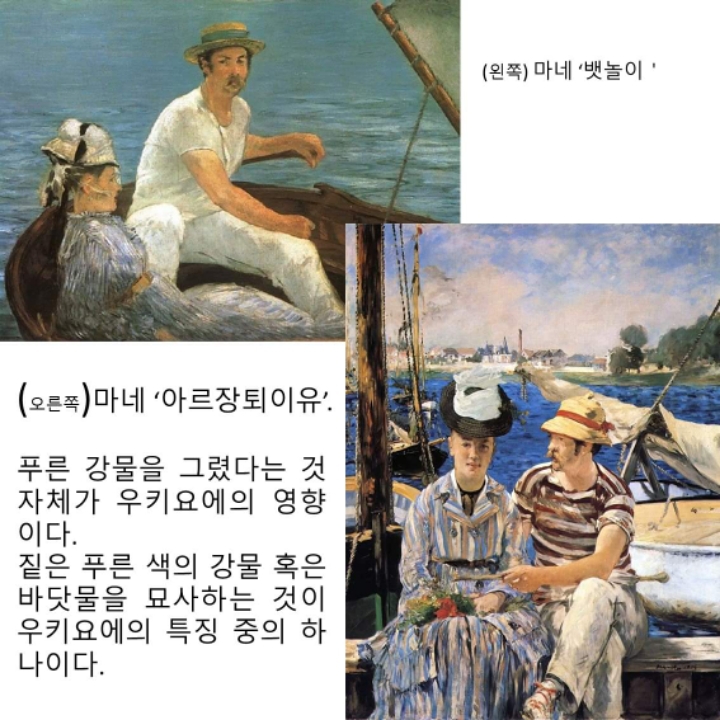 금빛 일본 병풍과 사무라이 그림으로 배경을 채운 ‘에밀 졸라의 초상’(Portrait d'Emil Zola, 1868)은 마네가 일본미술의 영향을 얼마나 강하게 받았는지를 짐작케 한다. '뱃놀이’ 또는 ‘아르장퇴이유'의 코발트빛 강물도 히로시게의 그림들을 강하게 연상시킨다. 강물을 주제로 삼았다는 것 자체가 우키요에의 영향이다 '명소 에도 백경’(名所江戶百景)에는 거의 빠짐없이 파란 강물 혹은 바닷물이 나온다.