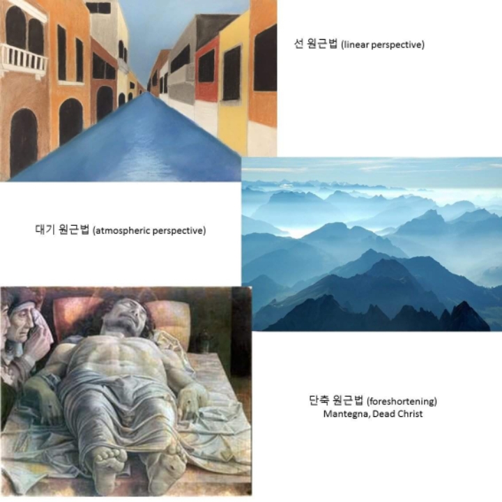 이처럼 화면을 X선으로 분할하는 방식을 선(線)원근법이라 하고, 산과 하늘을 그릴 때 가까운 부분은 짙은 색깔, 먼 부분은 엷은 색깔로 칠하는 것을 대기(大氣)원근법이라 하며, 인체나 사물을 수축된 듯이 그려 특정의 자세를 묘사하는 것을 단축 원근법이라 한다. 이렇게 원근법을 사용한 그림은 화면 전체가 마치 캔버스 속으로 쑥 들어간 듯한 깊이가 있고, 인물과 사물은 볼륨감이 있다. 우리가 살고 있는 3차원의 실제 세계를 방불케 한다. 미국의 미술사학자 클레멘트 그린버그는 이런 원근법의 방식을, 마치 캔버스에 공동(空洞)을 뚫기라도 하는 듯한 기법이라고 말했다.