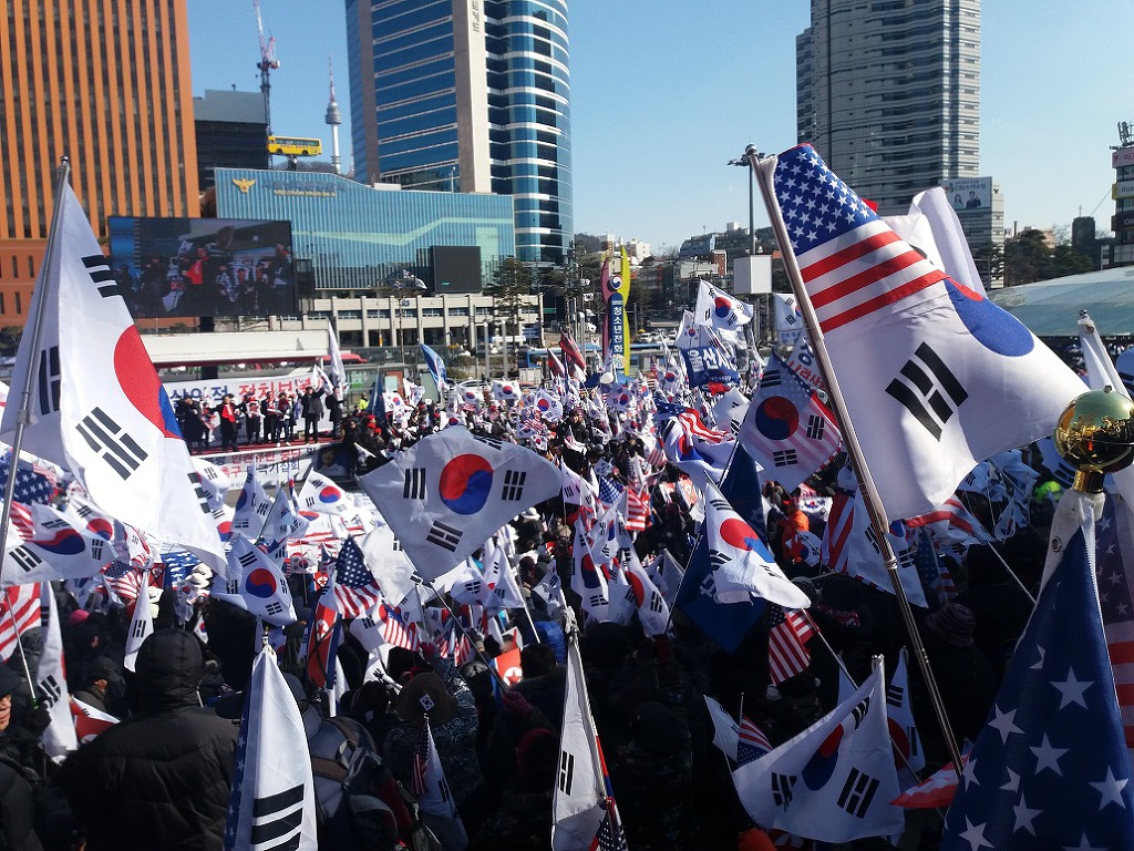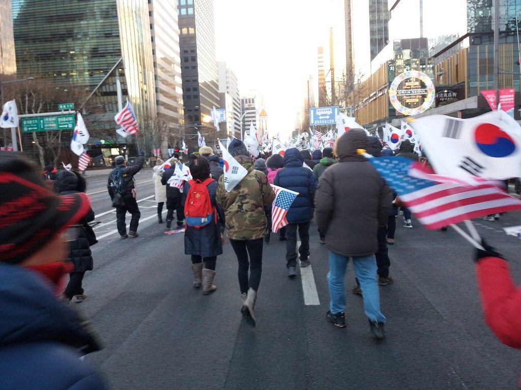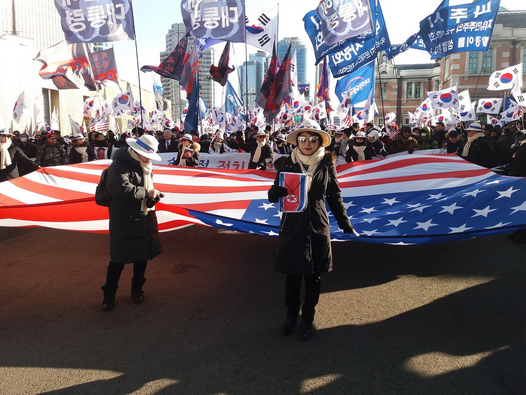 태극기를 선두로 빠져 나가고 있습니다. 성조기가 뒤를 따르고 수많은 깃발과 현수막이 서울역을 빠져 나가고 있습니다.