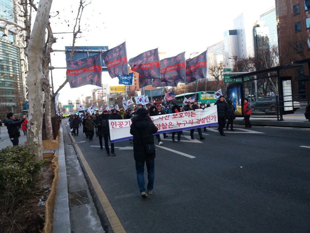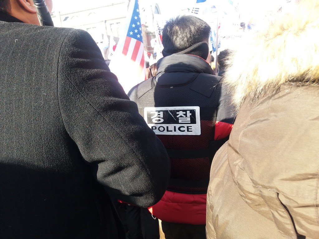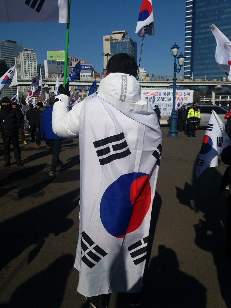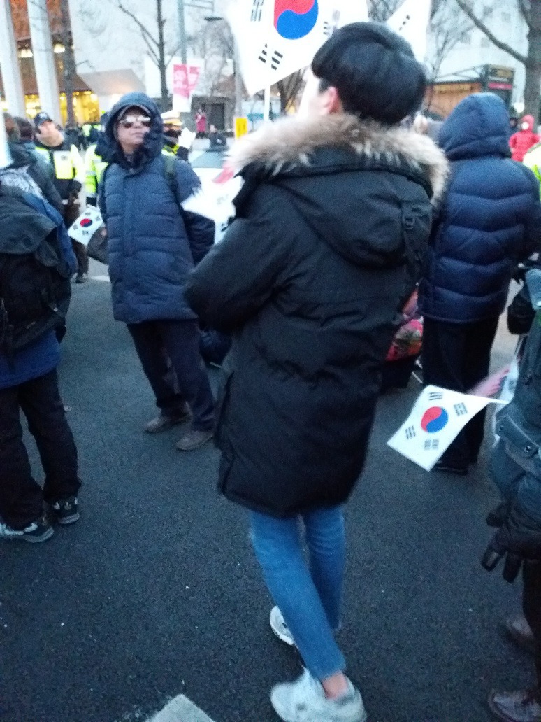 하도 추워서 태극기를 두른 모자를 집어 넣고 태극인이라는 표식이 없자 싸움 말리고있는 나를 어르신이 경찰로 오해하고