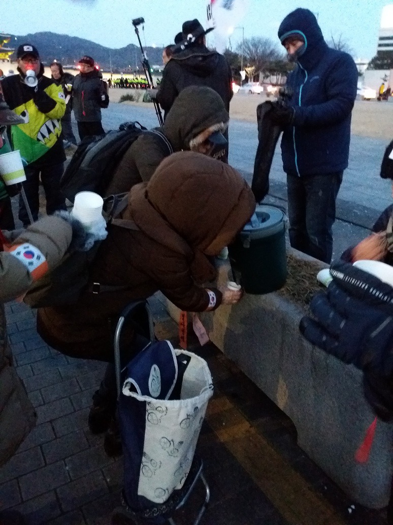 힘든 사생결단 행진을 마치고 들어오신 동지님들이 오늘도 밤쌔끓인 자유민주생강차를 마시면서 추위를 녹이고 있습니다.
