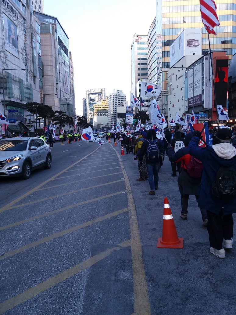 오늘도 명동을 빠져 나가면서 다른단체분들 태극인들과 조우합니다. 더 많은 사람들이 참여하여 양쪽도로