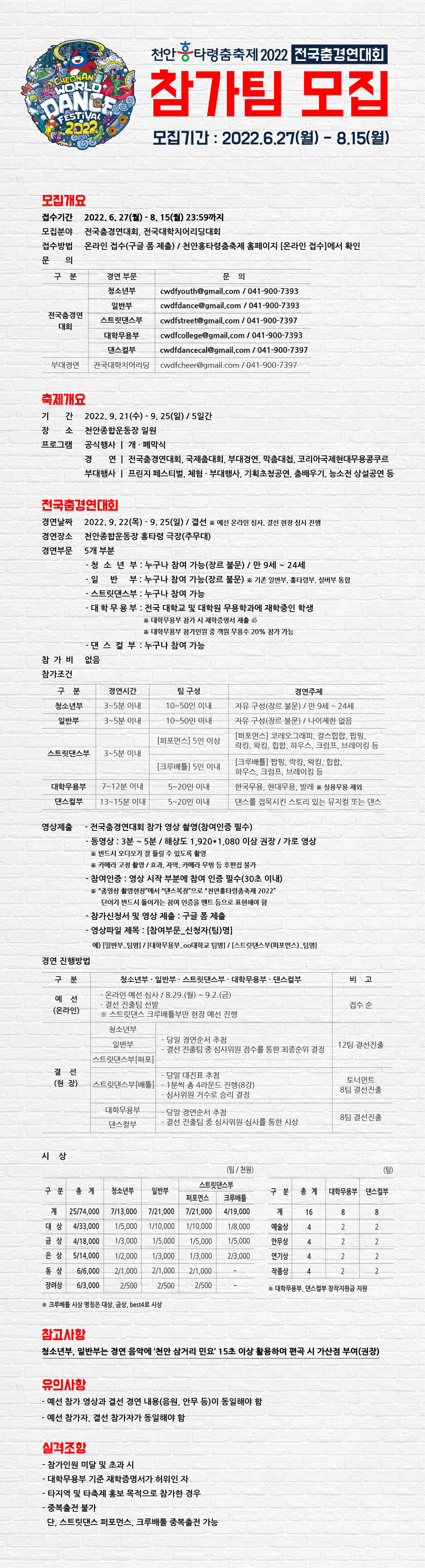 「천안흥타령춤축제 2022」 전국춤경연대회 참가팀 모집안내 작성자한마음|작성시간22.07.07|조회수17 목록 댓글 0 글자크기 작게가 글자크기 크게가 다음검색 현재 게시글 추가 기능 열기 북마크 공유하기 신고 센터로 신고 댓글 댓글 0 댓글쓰기 답글쓰기 댓글 리스트