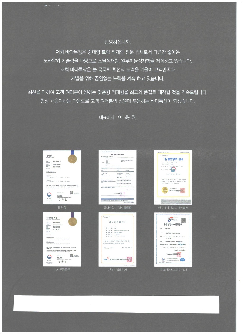 아래에 금번 인천 송도컨벤시아에서 개최된 상용차전시회에서 충품된 바다특장 제품과 카타