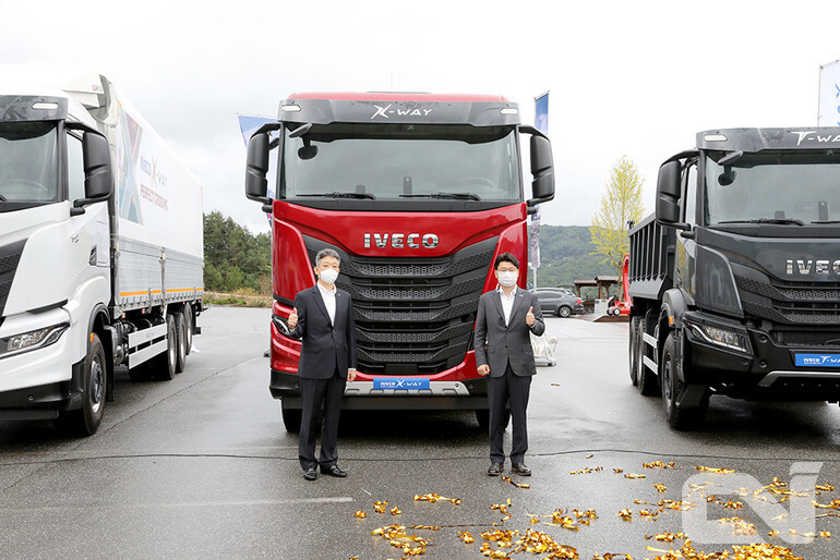 이베코코리아 최정식 지사장과 조관주 상무가 5일 인제 스피디움 야외전시장에서 공개한 ‘X-WAY’와 ‘T-WAY’ 모델 앞에서 포즈를 취하고 있다