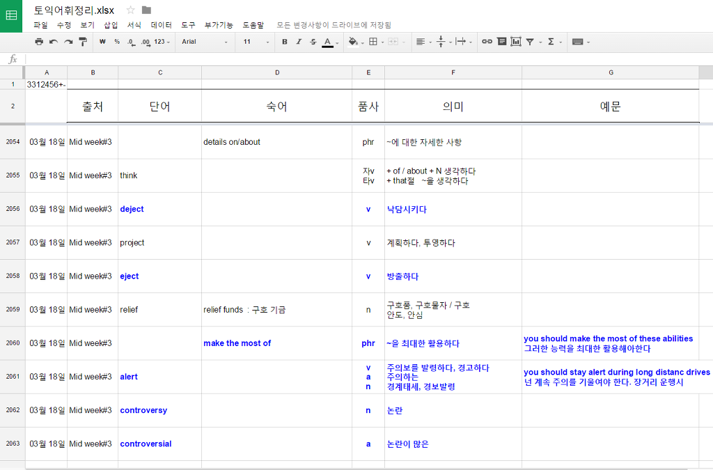 다음은 많이들 강조하시는 오답노트인데... 전 손으로 쓰는 시간이 아까워서 구글 스프레드시트 이용했습니다.