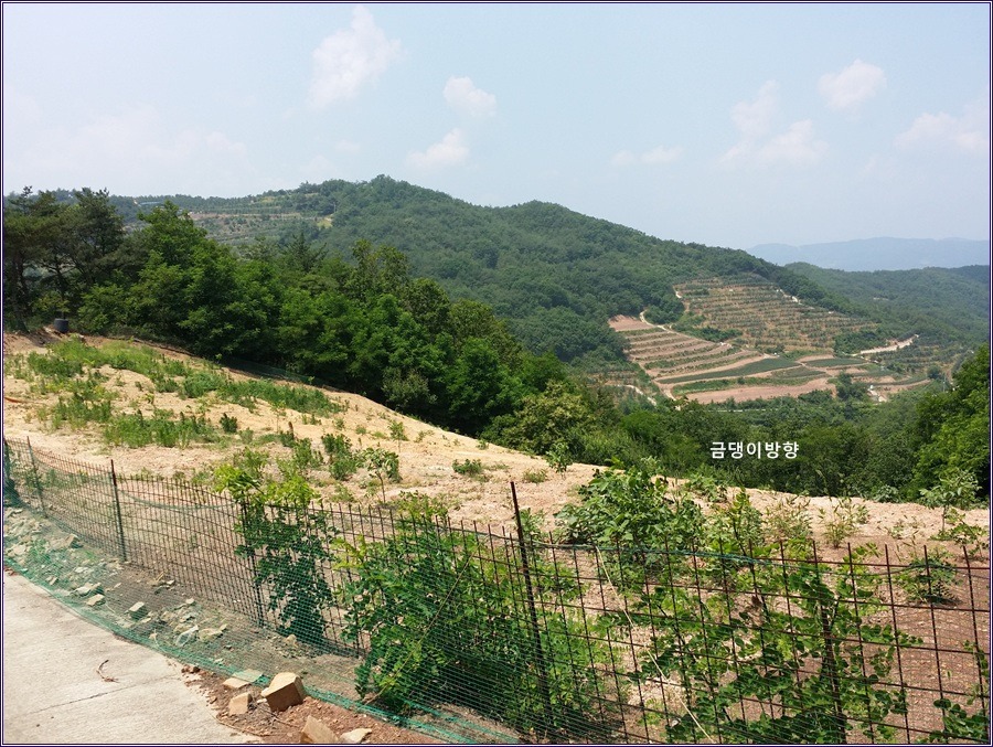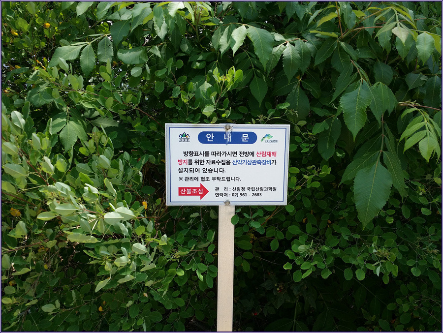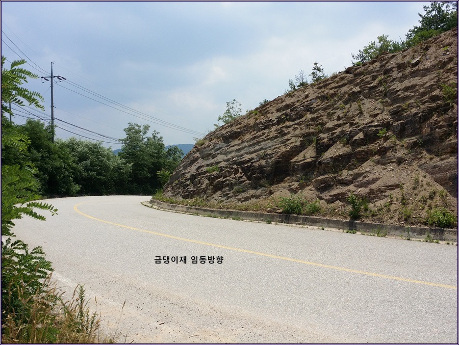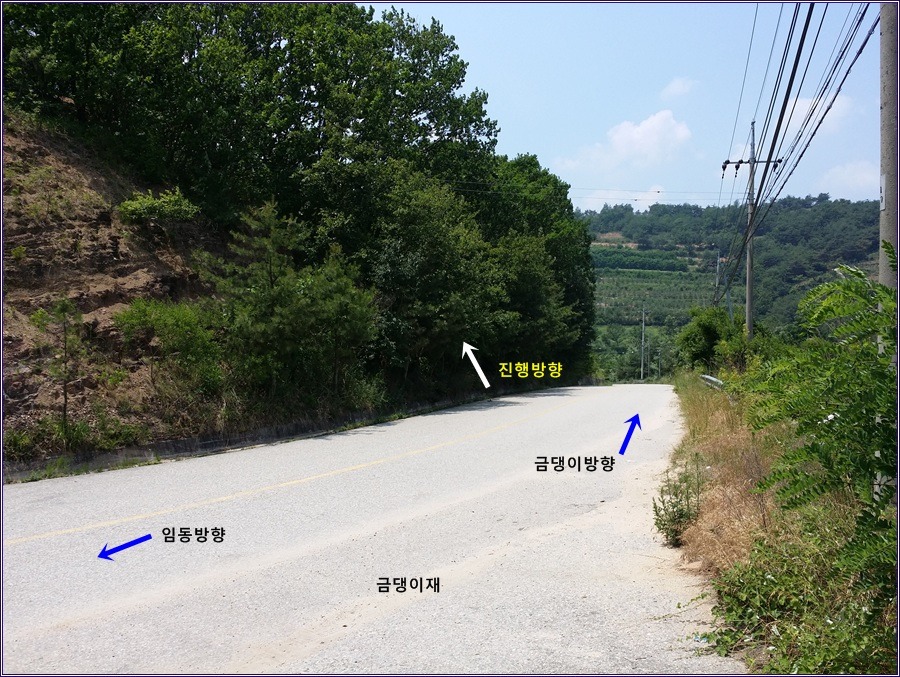 12:13 금댕이재에 도착했습니다 좌측의 임동과 우측의 금댕이를 경계하며 급경사의 절개지가 형성된 편도1차로에서 우측으로 짧게 이동후 잡목지대의 가파른 절개지를 짧게 올라 사과나무 과수원을 조심스럽게 통과하여 세멘트 임도를 따라 좌향으로 내려가 진행해야 할 마루금에 조성된 과수원을 우회하여 이동통신사의 기지국이 설치된 능선정상에서 우향으로 전환되어 “산악기상관측장비” 안내판이 설치된 지점에서 우향으로 이어지는 세멘트 도로를 우측의 과수원과 나란한 오름길을 긴 시간동안 올라서 진행하던 도로가 우향으로 굽어 돌아가며 산불감시초소와 산악기상관측장비가 설치된 봉우리에 도착합니다 (금댕이재에서 우측으로 내려가 좌측과수원으로 연결되는 세멘트포장 임도를 진행하여 기지국으로 올라야합니다) 금댕이재에 도착했습니다 ↓