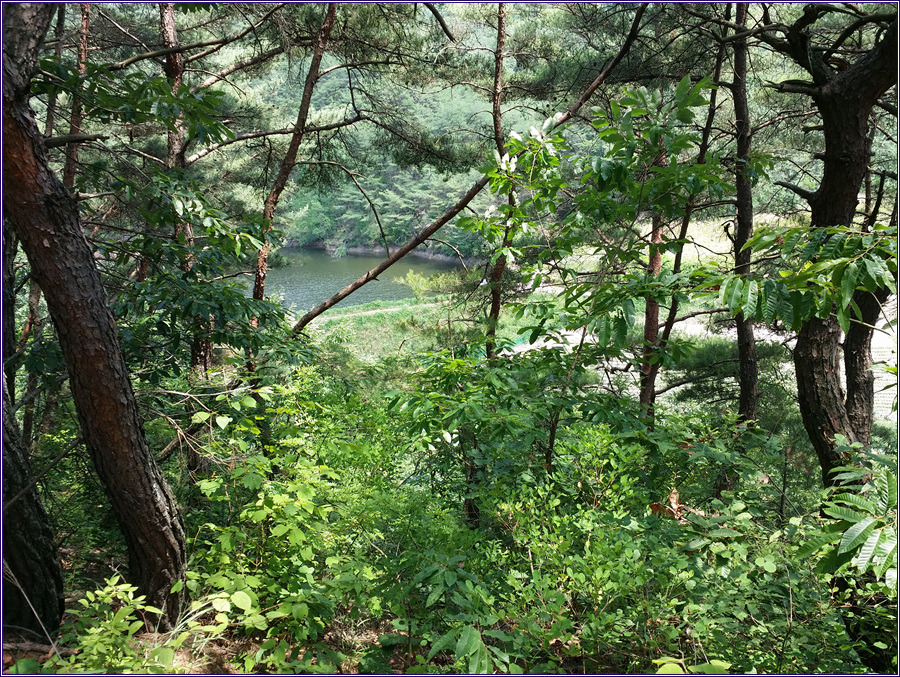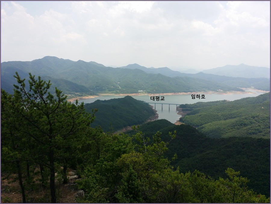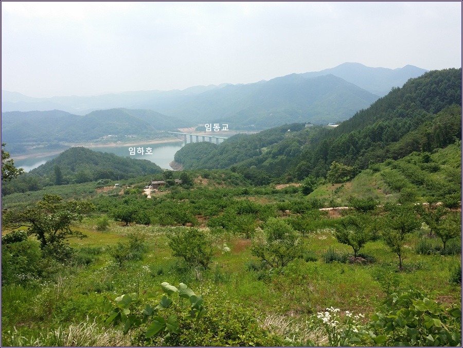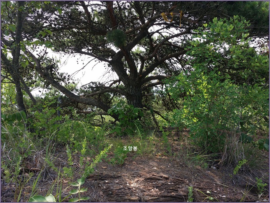 10:31 조망봉(380m)에 도착했습니다 여러 갈래로 가지를 뻗고 있는 키 작은 소나무가 자리하며 후방으로 지나온 뱃티재 방향의 마루금과 위리 방향의 마을이 조망되는 봉우리에서 짧게 내려가 좌측과 우측으로 연결되는 넓은 임도형식의 길과 합류되어 완만하게 진행후 정면에 녹슨 휀스철망이 설치된 지점에서 철망문을 통과하여 넓게 조성된 개활지에 도착해 좌측의 임하호에 설치된 임동교와 과수원의 가옥을 조망후 우측의 개활지를 진행하여 좌측 과수원의 가옥으로 연결되는 세멘트 도로의 끝지점에서 정면의 과수원을 통과해 철사줄에 묶여있는 휀스철망 문을 지나 흙묘1기가 자리한 묘터에 도착하여 점심식사를 마치고 중장비가 정지작업중인 폐임도를 짧게 올라 잡목이 우거진 좌측의 급경사 절개지를 올라 세멘트로 포장된 임도에 도착하여 좌향의 포장임도를 진행후 지형도에 표기된 삼각점봉(374.0m)을 무심코 지나서 정면으로 올라야할 초소봉이 조망되는 지점을 지나 진행하던 세멘트 임도를 버리고 좌측의 잡목지대 오름길을 짧게 올라 봉분이 커다란 흙묘 여러기가 조성되있으며 정면으로 초소봉 방향의 마루금이 조망되는 묘터에서 좌향의 내림길을 내려가 우측의 세멘트도로가 연결되며 좌측에 넓은 물 웅덩이가 파여있는 지점을 지나 넓은 밭을 통과하여 금댕이재에 도착하려했지만 아카시 나무가 우거진 급경사로 인해 내려서지 못하고 진행했던 길을 다시 되돌아가 물웅덩이에서 세멘트도로를 진행하여 금댕이재에 도착합니다 조망봉의 소나무입니다 ↓