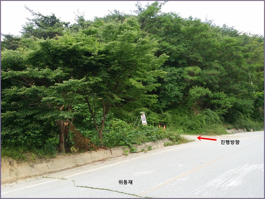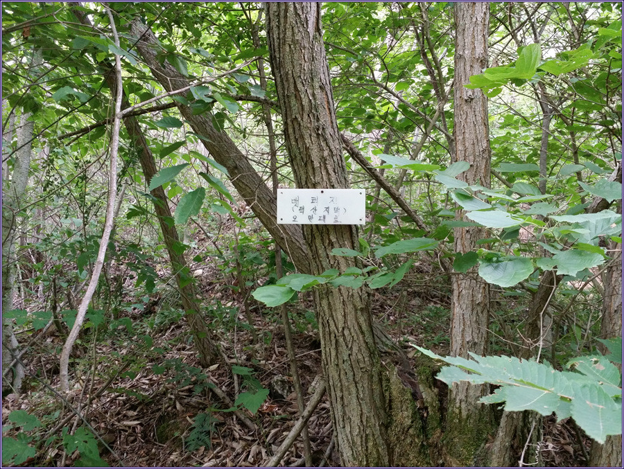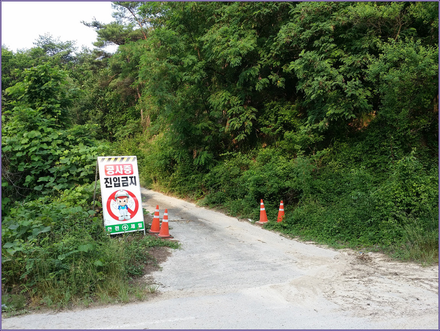 06:51 위동재를 출발했습니다 우측에 수준점이 설치되어있으며 좌측 들머리에 “공사중 진입금지” 안내판이 설치된 세멘트 임도가 연결되는 위동재를 출발하여 우측의 급경사를 오르지 못하고 세멘트 임도를 따라 올라 임도가 좌향으로 굽어 돌아가며 우측의 마루금이 가깝게 위치한 지점에서 짧은 절개지를 올라 마루금과 합류되어 좌향의 오름길을 올라 낮은 봉우리를 지나 조금전에 헤어졌던 임도를 횡단하여 잡목지대의 오르내림을 반복하여 흙묘1기가 자리한 얕은 안부에서 우측의 임도와 다시 합류후 임도를 따라 짧게 진행하여 임도가 좌향으로 굽어 돌아가는 지점에서 우측의 잡목지대 오르막길을 올라 좌우측으로 길이 갈라지는 갈림길에서 우측2시 방향의 완만한 길을 좌향과 우향으로 번갈아 진행하여 우측에서 뚜렷한 길이 합류되는 갈림길을 지나 396.6m봉에 도착하여 좌측10시방향의 내림길로 내려가 임도 삼거리에 도착합니다 위동재를 출발했습니다 ↓