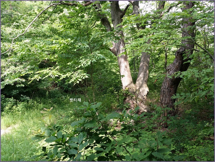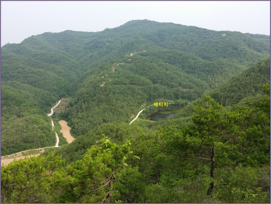 09:32 뱃티재에 도착했습니다 좌우측으로 넓은 임도형식의 길이 연결되며 굵은 느티나무와 소나무가 자리한 뱃티재를 통과하여 가파른 오르막길을 올라 능선정상에 도착후 완만한 길로 전환되어 후방으로 지나온 359.9m봉이 조망되며 흙묘1기가 자리한 묘터봉에 도착하여 숨을 고른후 짧은 오르막길을 올라 흙묘1기가 자리한 무명봉에 도착하여 내림길을 내려가 넓고 완만한 안부를 통과하여 오르막길로 전환되어 긴 시간동안 올라서 좌우측의 길이 갈라지는 등고선상의 380m봉에 도착하여 좌측10시방향의 완만한 내림길을 내려가 별다른 특징없이 진행후 356m봉을 지나 좌우측으로 길이 갈라지는 갈림길에서 좌측의 짧은 오름길을 올라 좌측 아래에 흙묘 여러기가 자리한 넓은 묘터를 지나 커다란 바위지대를 통과후 조망봉에 도착합니다 뱃티재에 도착했습니다 ↓