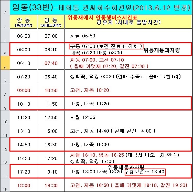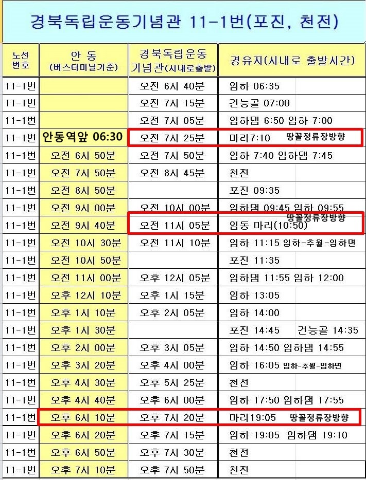 안동역 앞(교보생명)에서 위동재로 진행하는 버스시간표입니다 ↓ 안동역 앞(교보생명)에서 땅꼴정류장을 경유하여 마동(마리)로 운행하는 시간표입니다 ↓