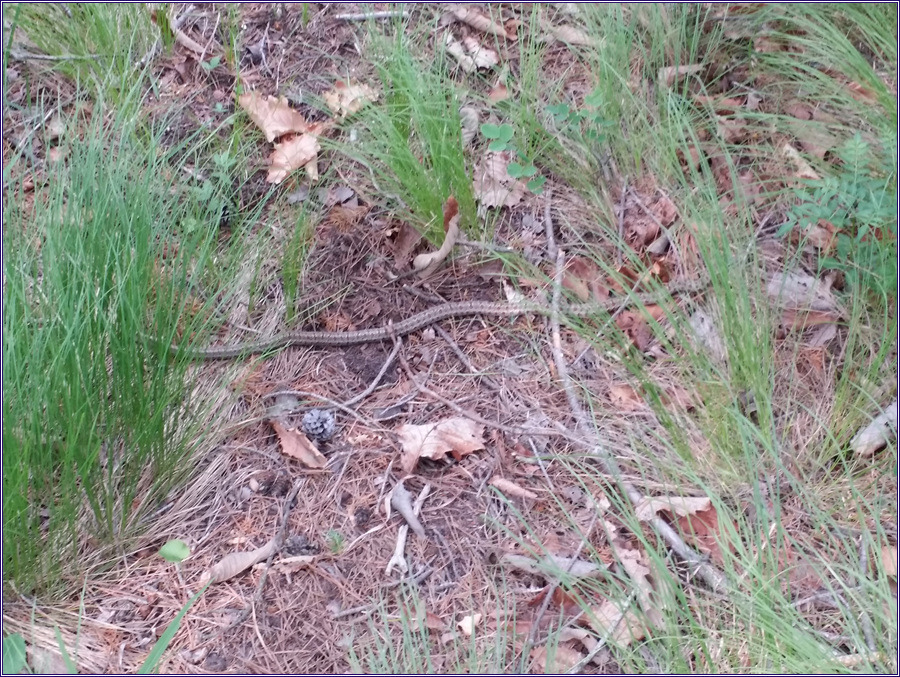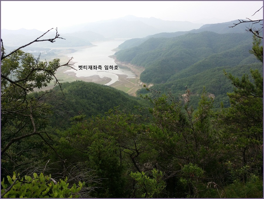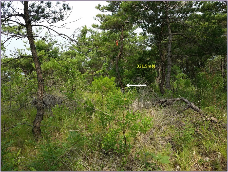08:43 321.5m봉에 도착했습니다 이봉우리에서 좌측9시 방향으로 전환되어 별다른 특징없이 진행하여 얕은 안부를 통과후 오름길로 올라 작은 바위들이 몰려있는 359.9m봉에 도착하여 짧은 휴식을 취한후 정면으로 임하호가 조망되는 지점을 지나 내리막길로 전환되어 오랜만에 만난 뱀이 길을 가로막고 일광욕을 진행중인 시간을 훼방하지 않기 위해 좌측으로 우회하여 봉분이 커다란 흙묘1기의 묘터를 지나서 뱃티재에 도착합니다 321.5m봉에 도착했습니다 ↓