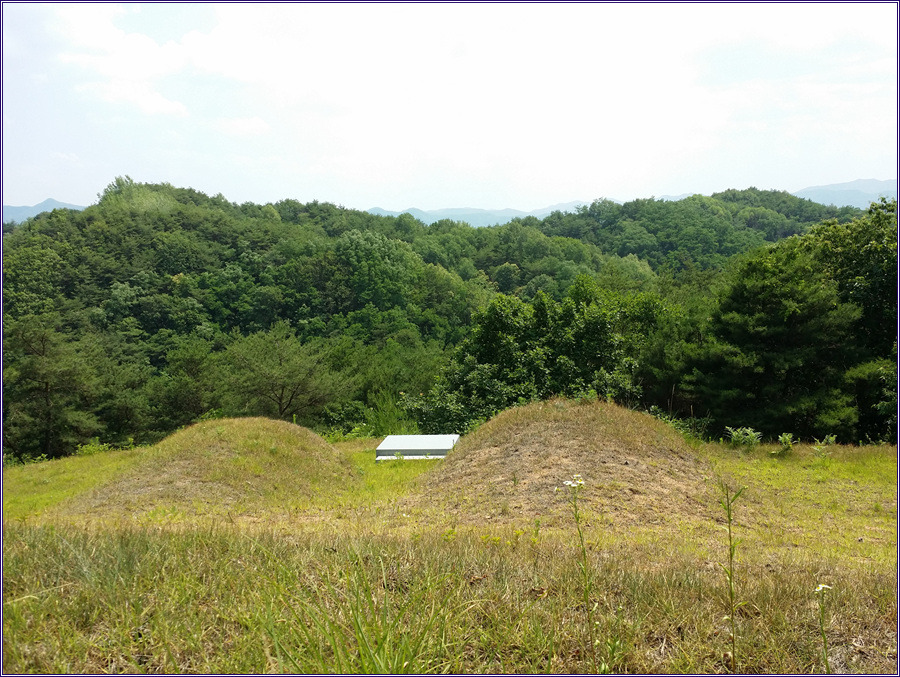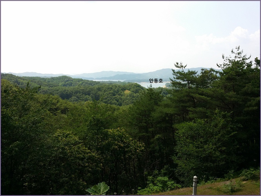 13:27 368.3m봉에 도착했습니다 좌우측으로 길이 갈라지는 갈림길 봉우리에 도착하여 좌측9시방향의 완만한 내림길을 내려가 좌측이 탁트여 지나온 산불감시초소봉과 진행을 잘못했던 395.7m봉이 조망되는 넓은 사면바위를 지나서 내림길을 내려가 커다란 바위를 좌측의 내림길로 우회하여 좌우측으로 급경사가 형성되어있으며 좌측 아래의 넓은 밭이 나무사이로 조망되는 내림길을 내려가 좌측의 저수지를 조망후 좌우측으로 뚜렷한 길이 연결되며 등나무가 군락을 이루고 있는 안부 갈림길을 통과하여 우측의 아카시나무 군락지와 나란한 등나무 넝쿨들과 잡목들을 헤치며 좌향과 우향으로 번갈아 진행하여 282.3m봉에 도착후 우측3시 방향으로 전환되어 넓고 얕은 구덩이가 파여 있으며 좌우측으로 능선이 분기되어 길이 갈라지는 갈림길에 도착해 좌측9시방향의 완만한 길을 이어가 봉분이 커다란 흙묘2기(“진성이씨의부부”)와 또 다른 흙묘2기가 자리한 넓은 묘터를 지나서 완만한 내림길을 내려가 좌우측의 희미한 길이 연결되는 얕은 안부를 통과후 잡목지대를 진행하여 좌측으로 길이 갈라지는 흙묘2기의 묘터 상단부에 도착하여 우측의 안동호를 조망후 내림길을 내려가 또 다른 좌측의 길이 갈라지는 묘터를 지나 좌향과 우향으로 특징없이 이어가 키가큰 비석이 설치되어있으며 봉분이 커다란 진성이씨의 흙묘1기가 자리한 묘터를 통과하여 좌우측의 길이 갈라지는 갈림길을 지나 흙묘1기가 자리한 묘터에서 우측3시방향의 절개지를 내려가 도로에 도착합니다 368.3m봉을 내려가 좌측의 사면바위에서 담았습니다 ↓