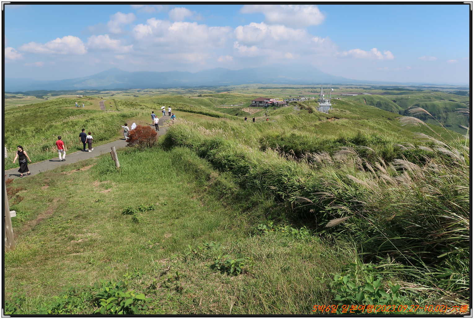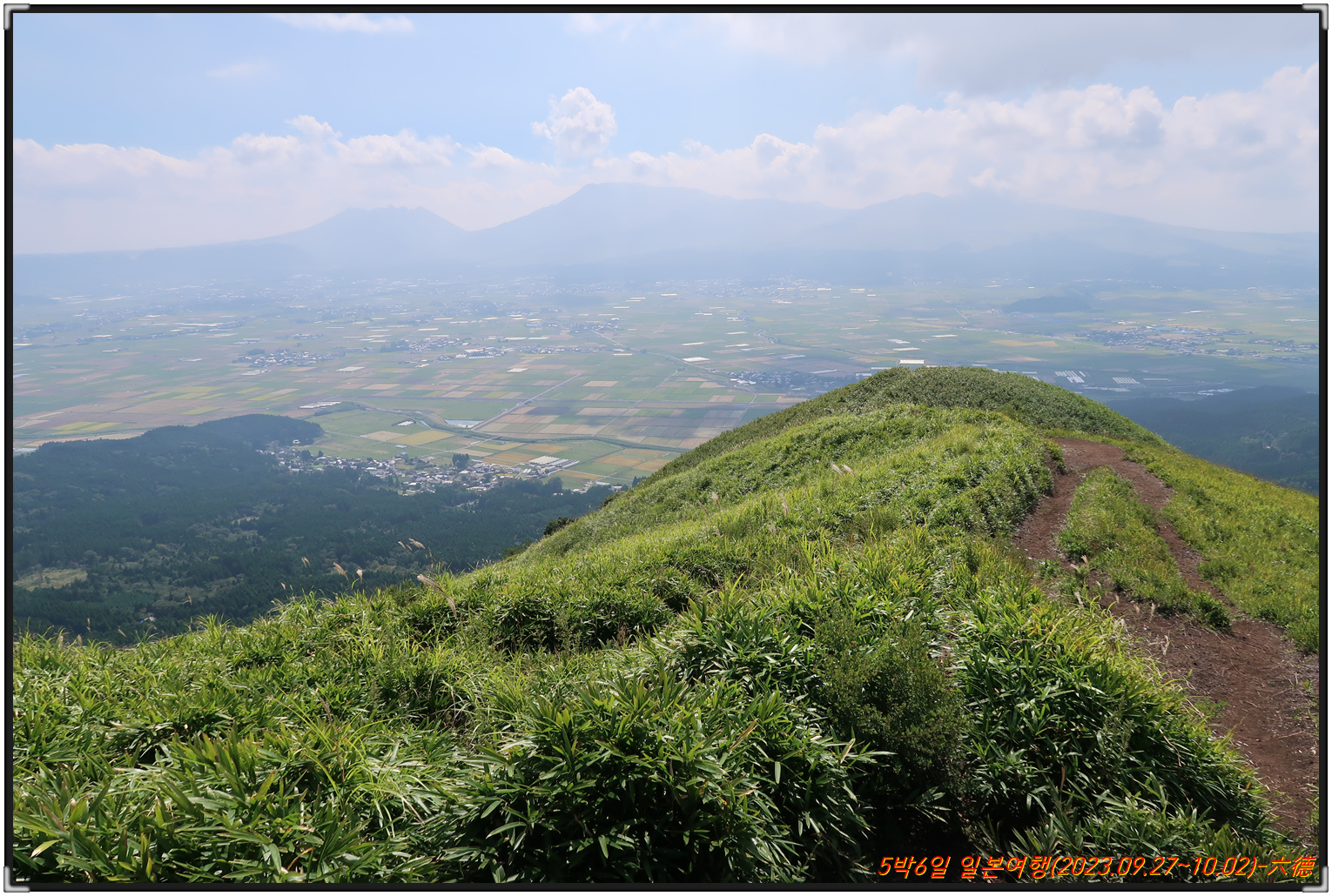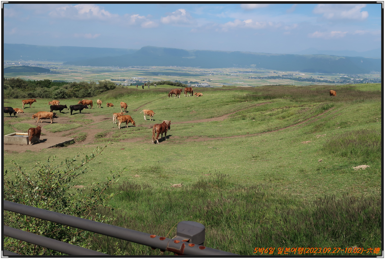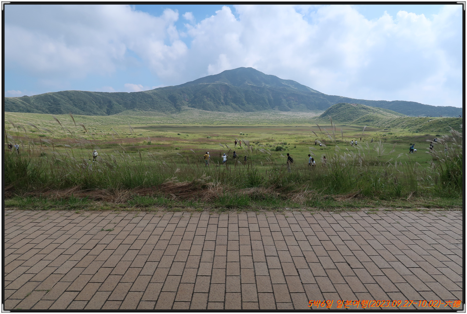 저 멀리 좌측으로 울퉁불퉁하게 솟아있는 산이 아소산인데 아소산은 다카다케(주봉), 나카다케(중봉), 네코다케, 에보시다케, 기시마다케 의 5봉우리로 이루어져 아소5악이라 부른다고 한다.