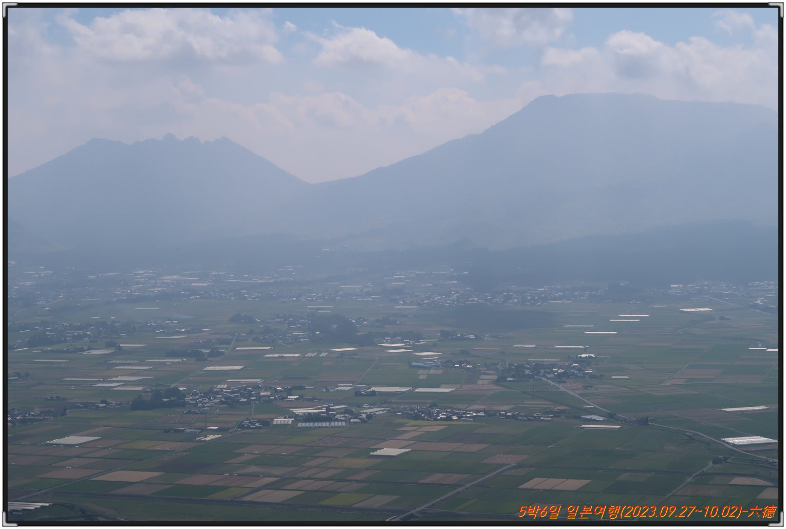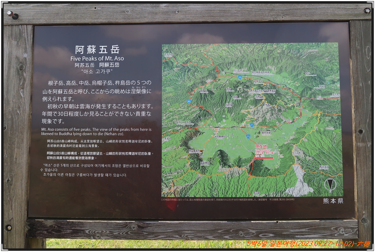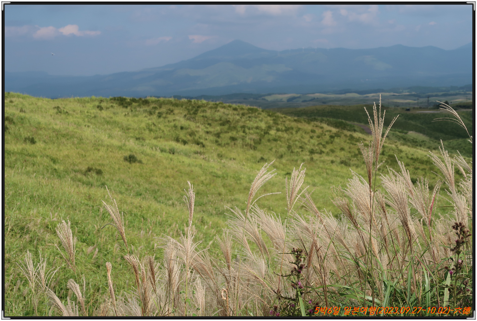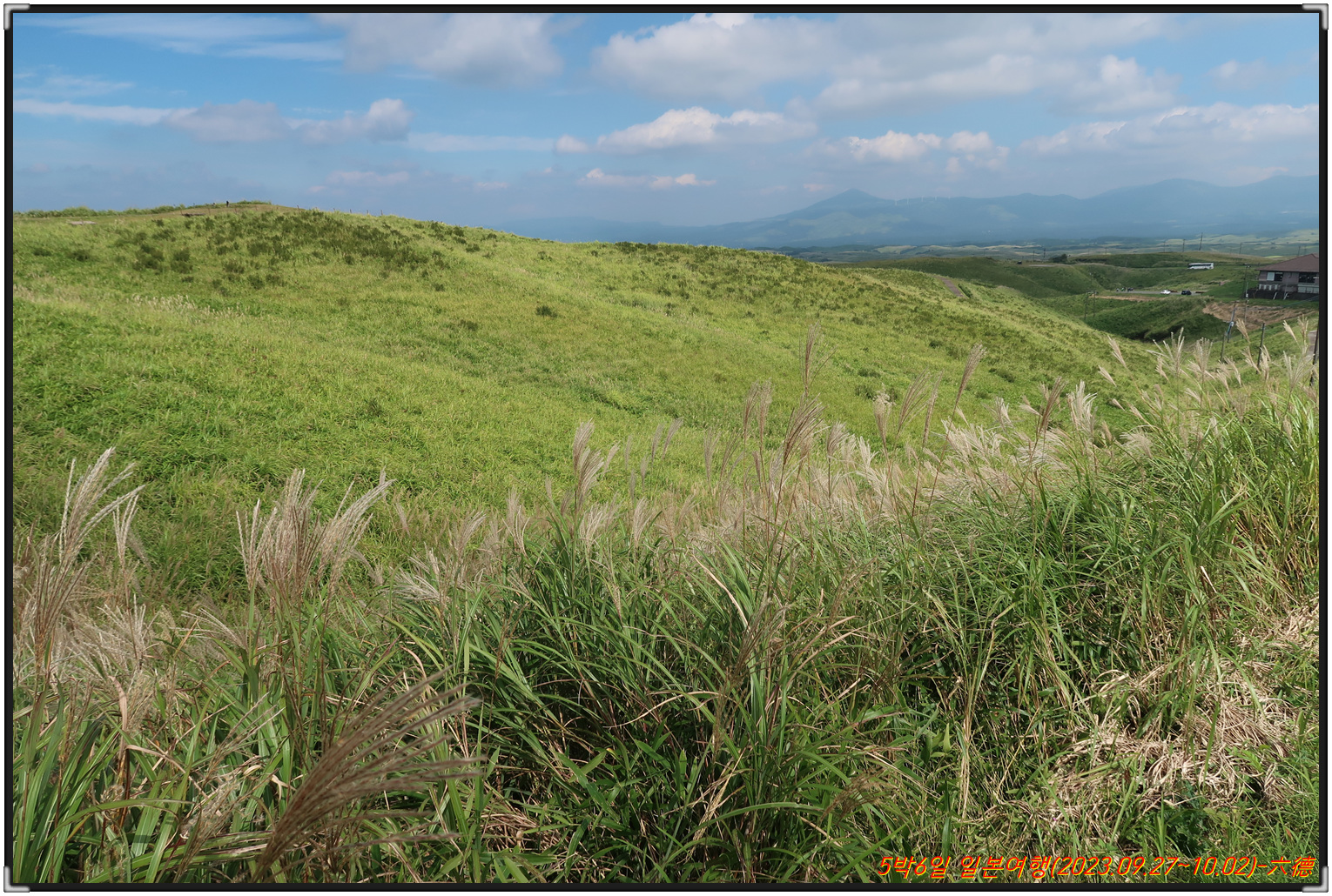 저 멀리 좌측으로 울퉁불퉁하게 솟아있는 산이 아소산인데 아소산은 다카다케(주봉), 나카다케(중봉), 네코다케, 에보시다케, 기시마다케 의 5봉우리로 이루어져 아소5악이라 부른다고 한다.