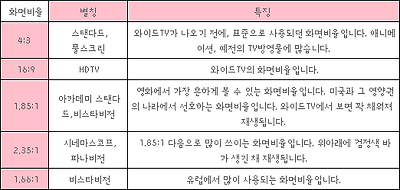 영화의 경우 1.66:1, 1.85:1, 2.35:1, HDTV 영상물의 경우 16:9 입니다.