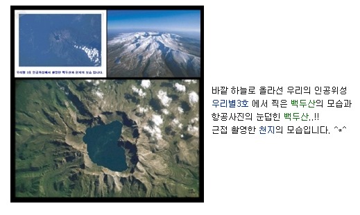 우리별3호에서 찍은 백두산과 인공위성을 통해 간도면적 측량(측량자: 토지공사의 조병현박사) 작성자간도 지기|작성시간10.06.02|조회수720 목록 댓글 0 글자크기 작게가 글자크기 크게가 다음검색 현재 게시글 추가 기능 열기 북마크 공유하기 신고 센터로 신고 댓글 댓글 0 댓글쓰기 댓글 리스트