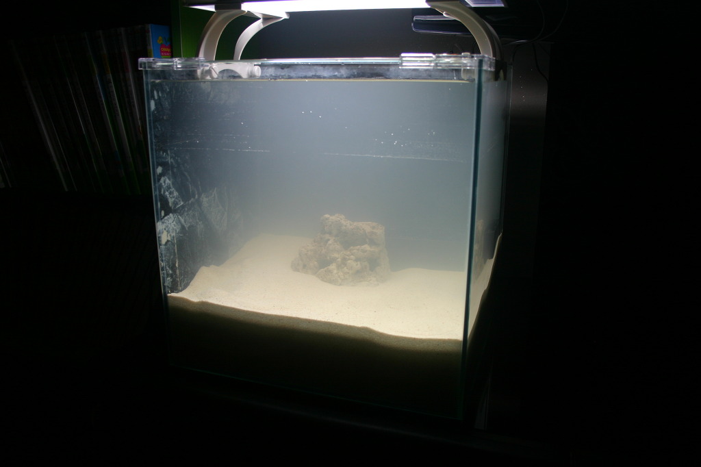 최후의 방법으로 역저면여과판위쪽 까지 슈가 산호사를 걷어내고 옆수조에 있던 2~3미리 산호사를 퍼와서
