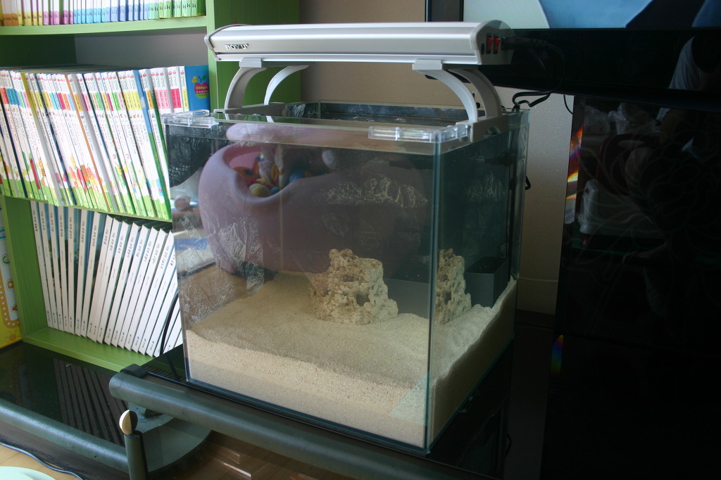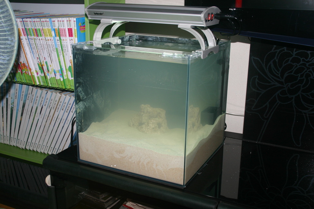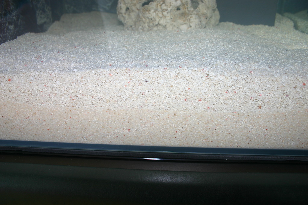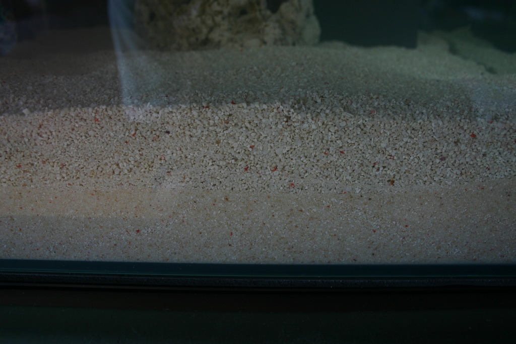 사진에서 보시는바와 같이 아래쪽은 기존 슈가 그대로이며 여과판위쪽만 2~3미리 산호사로 교체했습니다.
