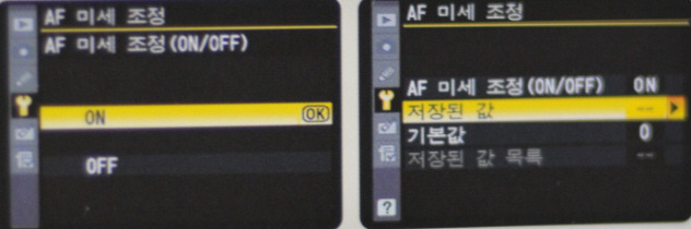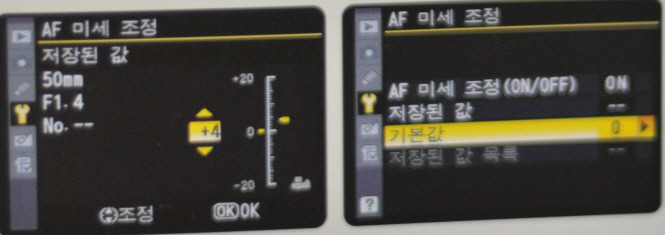 2. 기본 값은 렌즈에 상관없이 일괄적으로 적용되는 바디의 초점 조절이며, 저장된 값은 각각의 렌즈마다 설정을 적용시켜주는 기능이다.