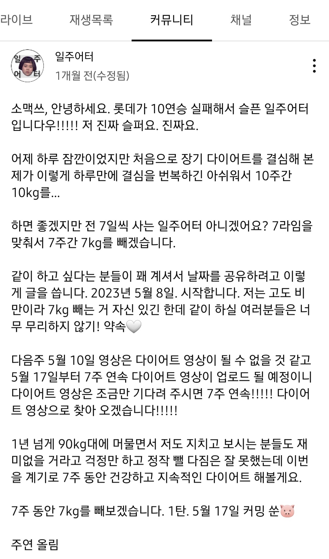 일주일 다이어트 컨텐츠를 올리는 유튜버라