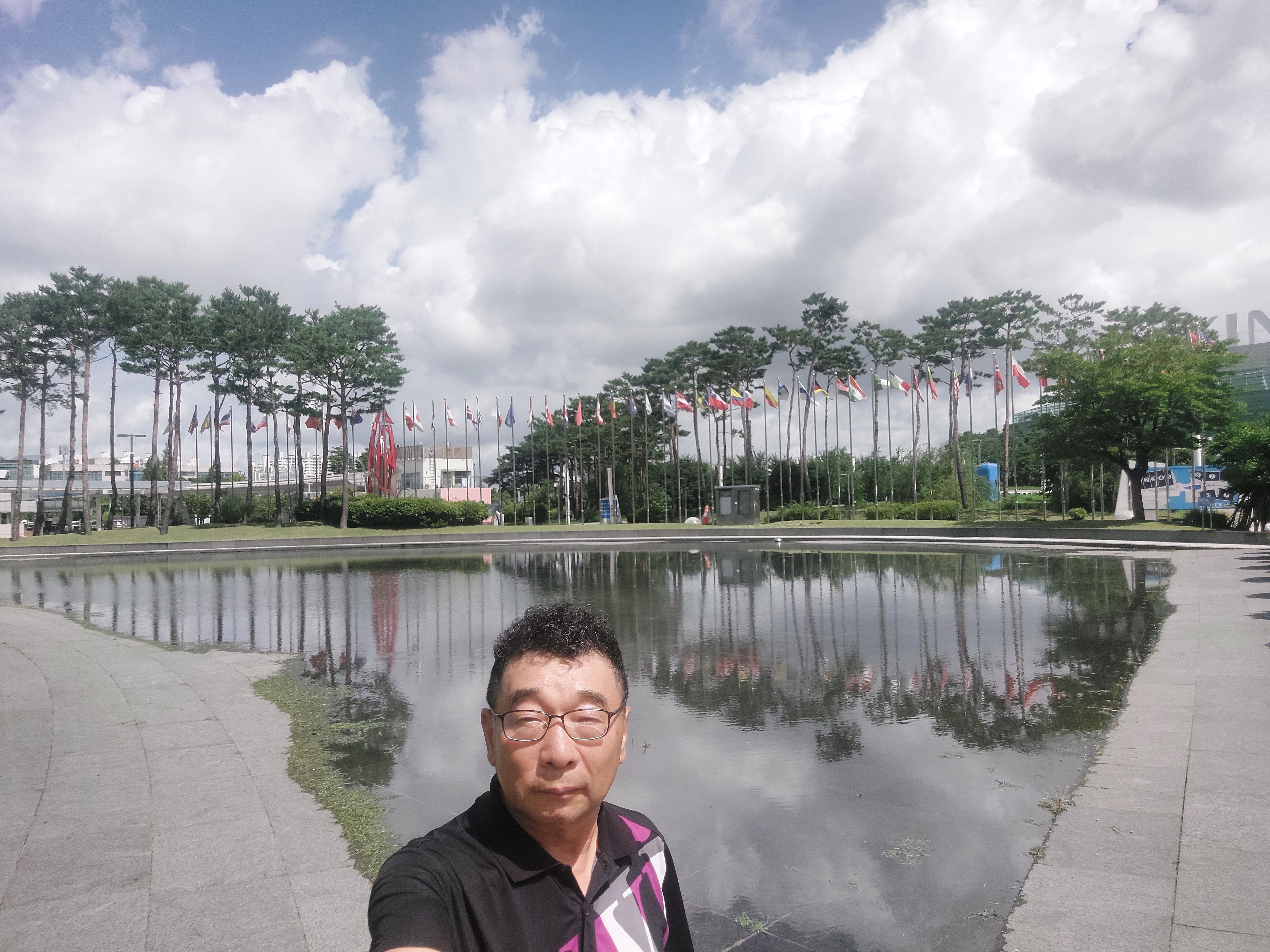 일산 킨텍스 외부..분수대 물과 만국기와 소나무