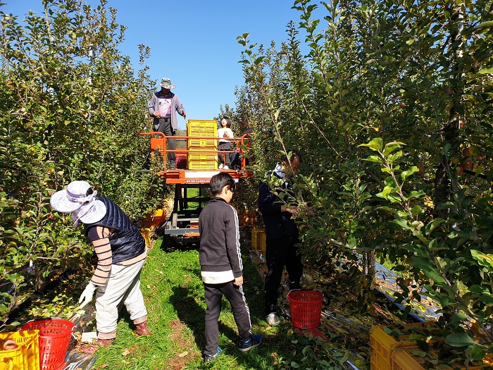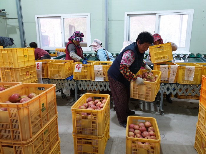작업장으로 실어 들인 부사사과는 선별을 하는데