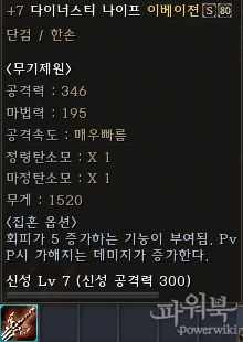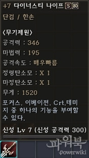 - 낮은 그레이드의 고인챈트 무기는 S80 그레이드의 +7 다이너스티 나이프 이베이젼(공격력 346)으로 실험을 진행한다.