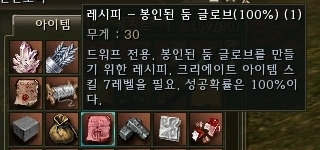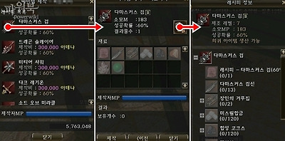 1. 드워프가 연 공방을 클릭하면, 아이템별 수수료와 성공확률을 확인할 수 있다. 2. 첫번째 메뉴에서 아이템의 아이콘을 클릭하면 아이템 공방에 필요한 재료를 확인할 수 있다. 3. 두번째 메뉴에서 우측 상단에 있는 레시피 버튼을 클릭하면, 아이템의 재료를 트리 형식으로 볼 수 있다. 4. 필요한 재료를 모두 모은 후 제작 버튼을 누르면 수수료를 지불하고 아이템 제작을 시도하게 된다. |