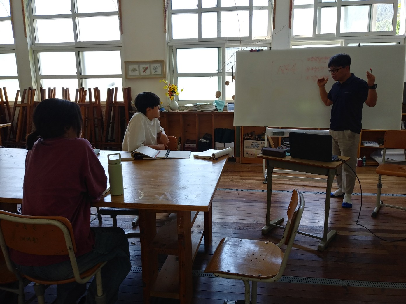 4,5,6동무들은 파도와 영어배움을 가집니다. 7,8학년 동무들은 재희언니와 수공예배움을 하였지요. 미술실에서는 후마가 9학년 동무들과 역사공부를 하였습니다.