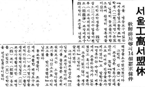 ▲ 서울공고 학생들의 맹휴 소식을 알리는 경향신문(1959. 3. 5)