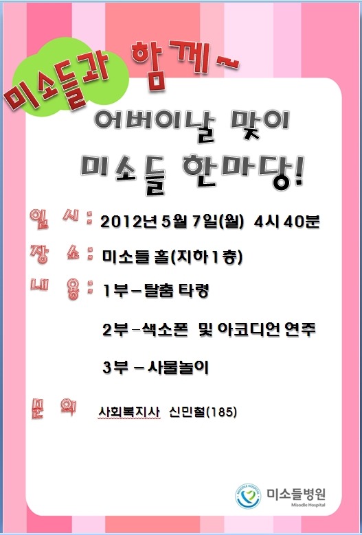 어버이날 맞이 미소들 한마당 안내 작성자신민철|작성시간12.05.03|조회수41 목록 댓글 0 글자크기 작게가 글자크기 크게가 건강하세요. 사회복지팀입니다. 5월의 어버이날을 맞이하여 미소들병원 사회복지팀에서 미소들한마당을 준비하였습니다. 환우 및 보호자의 심신에 도움이 되어 드리고자 준비하였사오니 많은 참여 부탁드립니다. 일 시: 2012년 5월 7일 오후 4시 40분 장 소: 미소들 홀(지하 1층) 대 상: 미소들병원 환우 및 보호자 양.한방협진 재활/요양 전문병원 - 미소들병원 - 다음검색 현재 게시글 추가 기능 열기 북마크 공유하기 신고 센터로 신고 댓글 댓글 0 댓글쓰기 답글쓰기 댓글 리스트