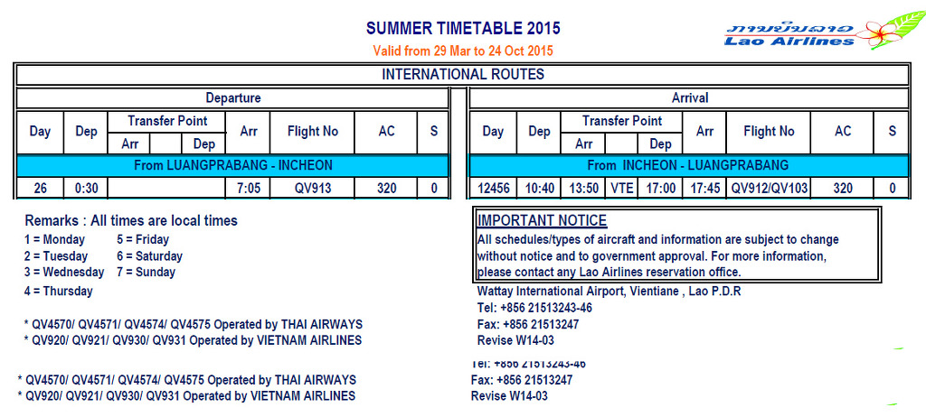 라오항공은 2015년 3월 29일부터 10월 24일까지 항공스케쥴(Flight Timetable)을 발표했는데,