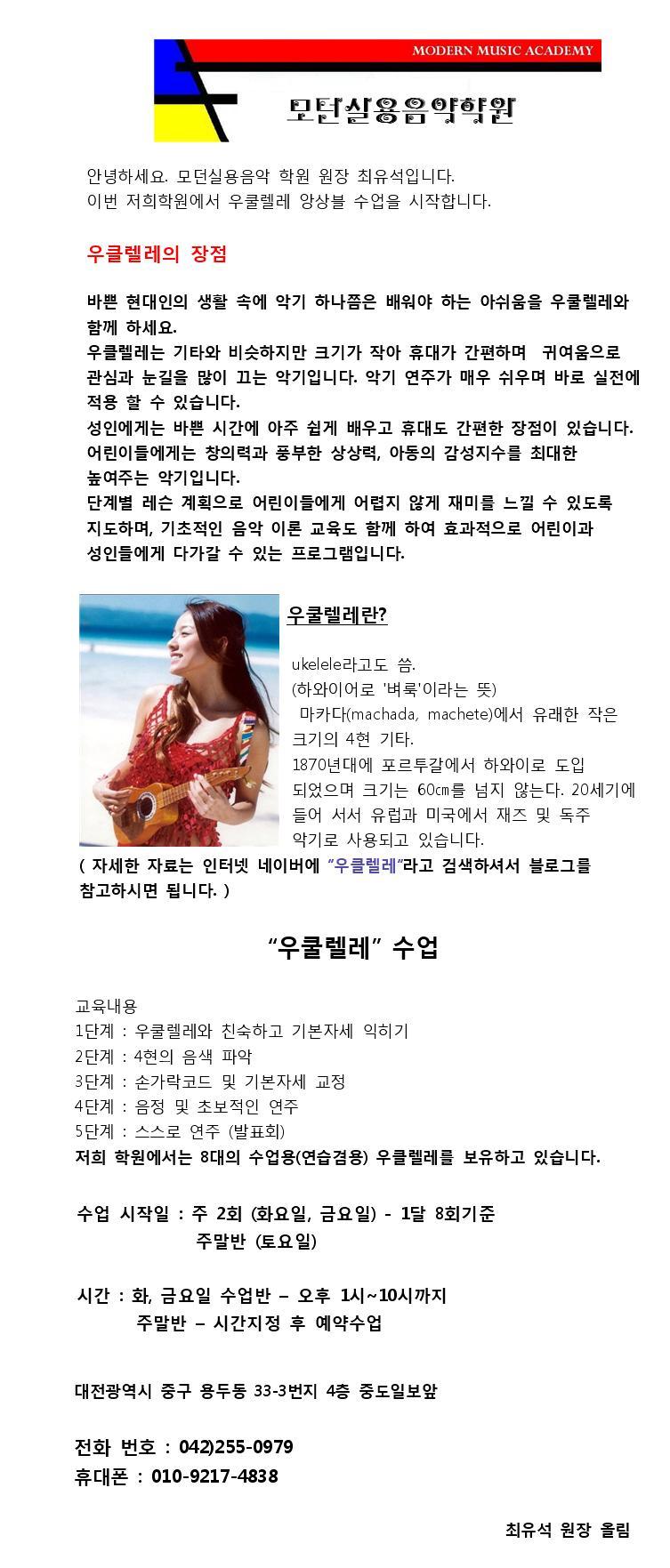 우쿨렐레 수업개설 안내!!!!!!! 작성자울랄라팬더|작성시간12.10.08|조회수37 목록 댓글 0 글자크기 작게가 글자크기 크게가 다음검색 현재 게시글 추가 기능 열기 북마크 공유하기 신고 센터로 신고 댓글 댓글 0 댓글쓰기 답글쓰기 댓글 리스트