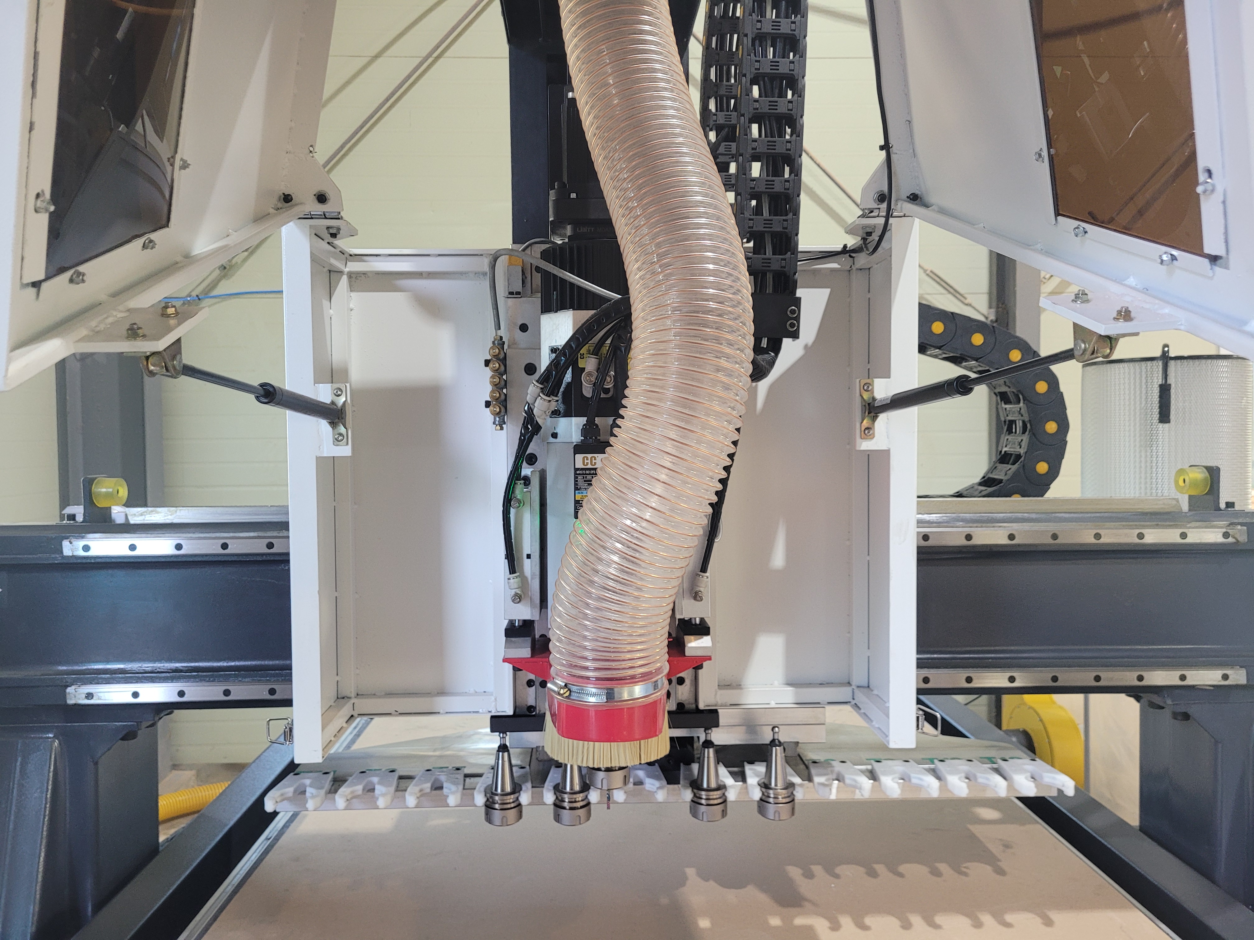 일반적으로 멀티스핀들 모델은 각각의 스핀들을 제어하기 위하여 에어쇼바와 많은 부품들이 장착되게 됩니다. 이는 결국 CNC의 하중이 늘어나 갠트리에 부하가 생길 가능성이 있습니다.