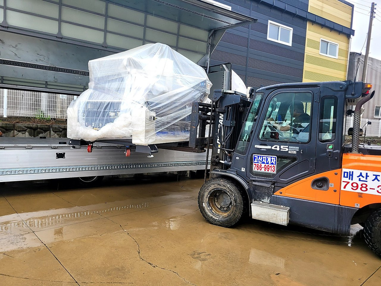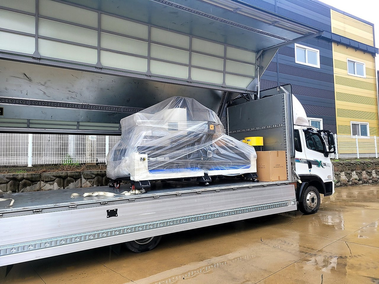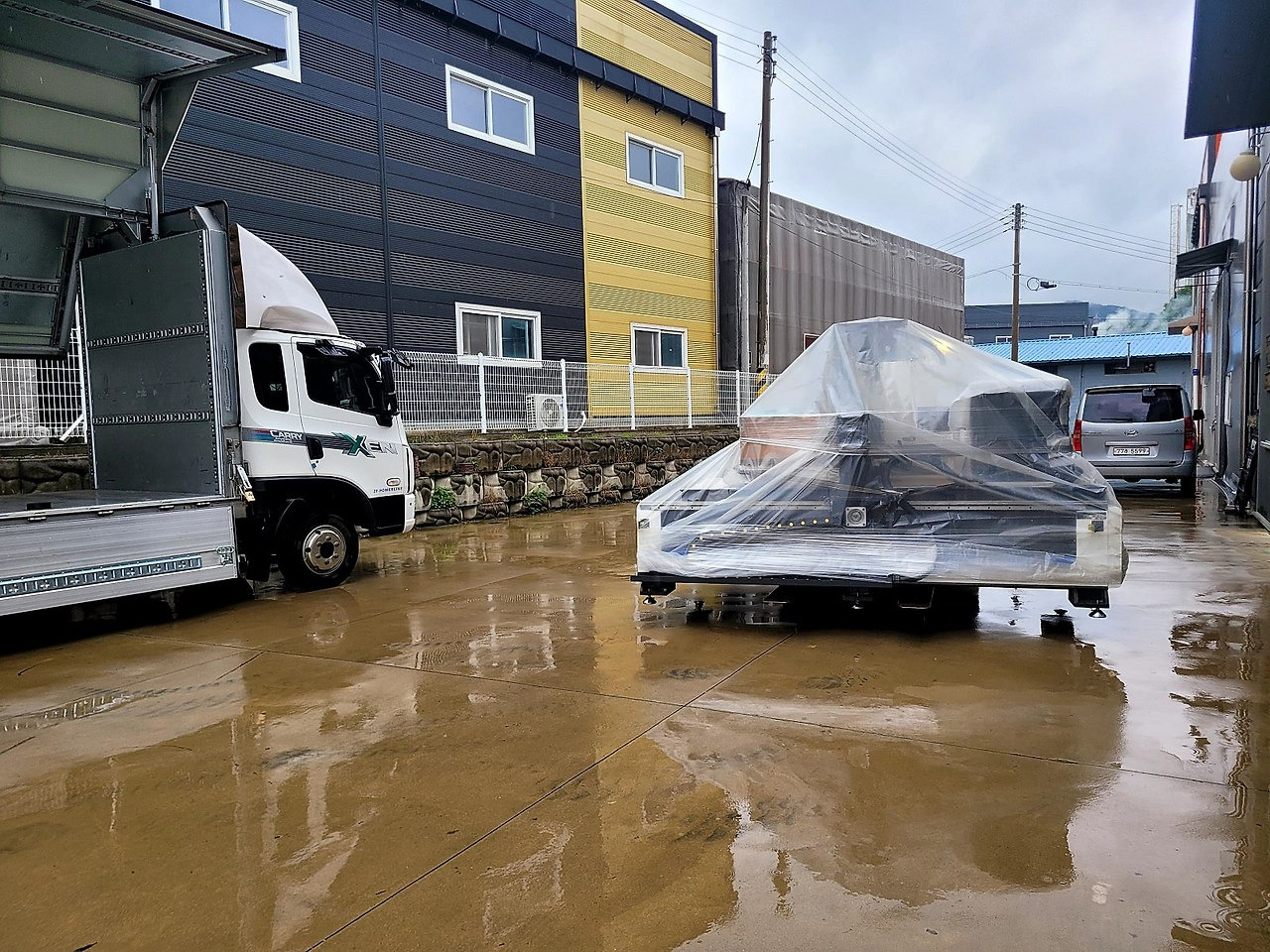 납품날 아침부터 비가 내렸지만 완벽하게 패킹되어 윙바디 차량을 이용하여 약속된 시간과 장소에 맞춰 설치되게 됩니다.
