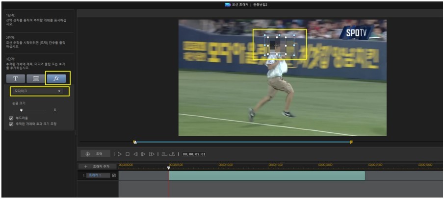 모션 트래커 화면의 좌측 메뉴에서 fx 를 클릭, 모자이크를 선택해 주세요.