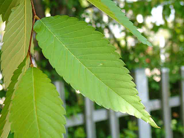 | 잎은 호생하며 긴 타원형, 타원형 또는 난형이고 점첨두 예저이며 길이 2-7(13)cm, 나비 1-2.5(5)cm로서 가장자리에 단거치가 있고 양면의 털근 점차 없어지며 측맥은 8~14쌍이다. 붉은 빛, 노란 빛으로 단풍이 든다. 엽병은 길이 15mm이다. | |||||||||||||||||||||||||
