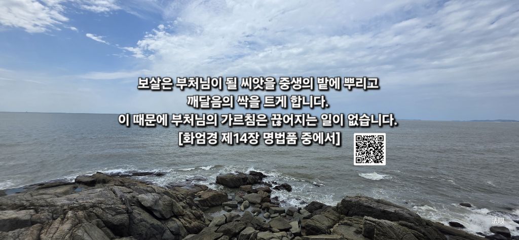 보살은 부처님이 될 씨앗을 중생의 밭에 뿌리고 작성자법안|작성시간25.12.25|조회수9 목록 댓글 2 글자크기 작게가 글자크기 크게가 보살은 부처님이 될 씨앗을 중생의 밭에 뿌리고 깨달음의 싹을 트게 합니다. 이 때문에 부처님의 가르침은 끊어지는 일이 없습니다. [화엄경 제14장 명법품 중에서] 다음검색 현재 게시글 추가 기능 열기 북마크 공유하기 신고 센터로 신고 댓글 댓글 2 댓글쓰기 답글쓰기 댓글 리스트 작성자맛장 | 작성시간 25.12.25 나무아미타불 나무아미타불 나무아미타불 _()_()_()_ 작성자전법심 | 작성시간 25.12.25 나무아미타불나무아미타불나무아미타불_()_()_()_ 댓글 전체보기