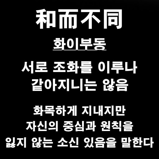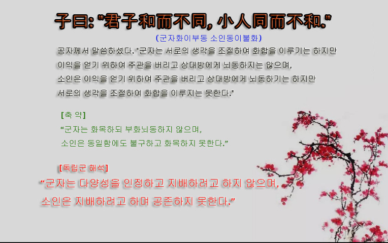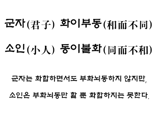"자왈 군자 화이부동(子曰 君子和而不同)하고 소인 동이불화(小人 同而不和)니라" 했어요
