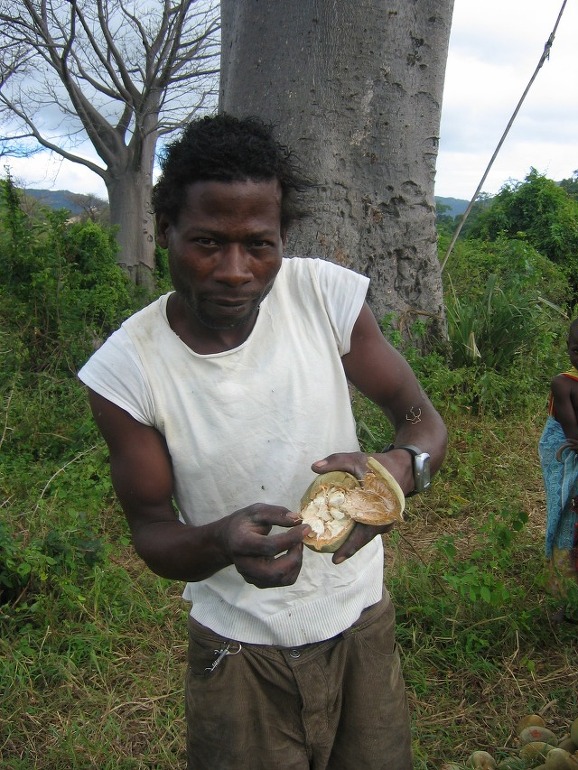 얼핏 목조건물같은 이곳은 바오밥 나무 내부를 개조하여 만든 바이다 . 바오밥 나무는 1000년이상 자라면, 속이 비어지게 되어 이런 공간이 생긴다고 한다. ♣과육에는 오렌지보다 여섯 배 많은 비타민 C, 우유 두 배 분량의 칼슘이 담겨 있다. 비타민 A와 B, 인과 철분까지 풍부하다. 열매 속 씨엔 양질의 단백질이 가득하고 잎 역시 무기질 덩어리다. 빈자들의 소박한 먹거리가 실은 영양 만점의슈퍼 푸드이었던 셈이다. ♣식량의 절대량이 부족한 아프리카에 이보다 더 좋은 소식은 없다. 집집 마다 바오밥 나무를 한그루씩 키운다면 해법이 되지 않을까? ♣단단한 열매는 용기로도 사용하며 주석 산 등을 함유하므로 새콤 달콤하여 그대로 먹거나 물에 우려내어 청량음료를 만든다. 비타민 C도 많다. 고열일 때는 발한제로 해열에 이용한다. ♣종자는 빻아서 끓여 죽을 쑤거나, 기장과 섞어서 먹는다. 종자는 유지가 풍부하여 바오밥 오일을 짠다. 노란색 불건성유로서 풍미가 있으며, 비누원료로도 쓴다. ♣아프리카와 마다가스카르에서는 로프나 말고삐, 민속악기의 현으로 사용되고, 카메룬에서는 가죽 이기기용 타닌제로 이용된다. ♣문제는 이 나무를 기르기 까다롭고, 10년은 되어야 열매를 맺는다. 그러나 말리등 몇몇 나라에서는 접붙이기와 옮겨심기를 통해 “바오밥 나무 과수원”을 가꾸는데 성공했다고 한다. ♣옛날에는 나무에 구멍을 뚫고 사람이 살거나 주검을 매장하기도 했다고 한다. 시체를 밀어 넣고 판막이로 입구를 못질해 막으면 바오밥 나무는 그를 껴안고 녹여 시간이 지나면 제 몸으로 받아들인다고.