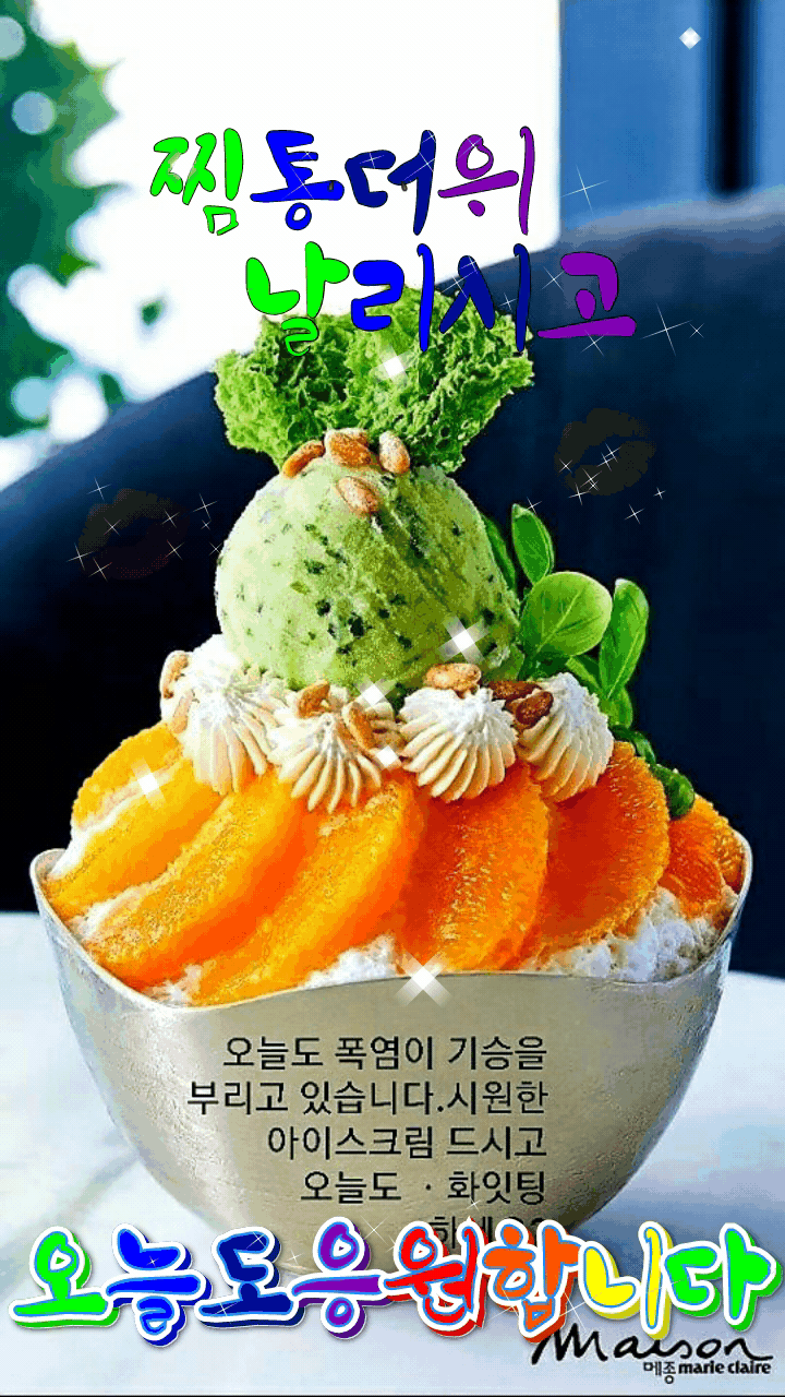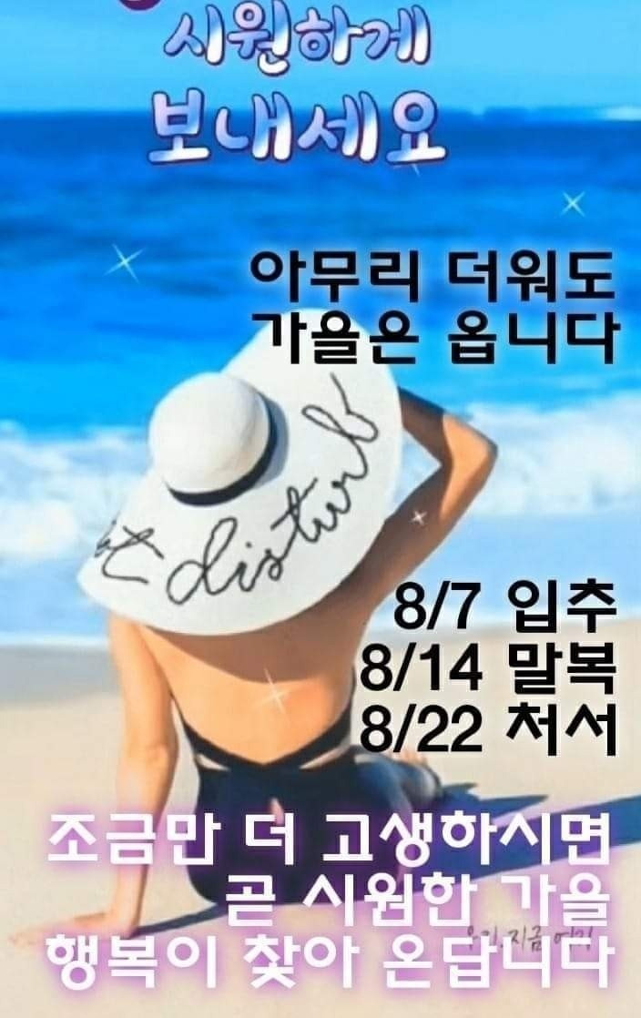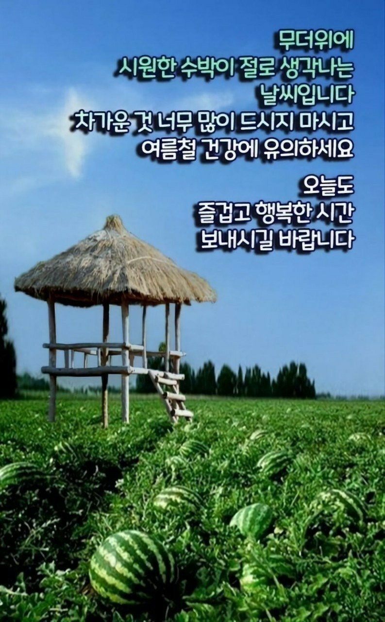 답댓글 작성자윤 세영 작성자 본인 여부 작성자 작성시간 24.08.09 요즘은 폭염이 계속 되니
