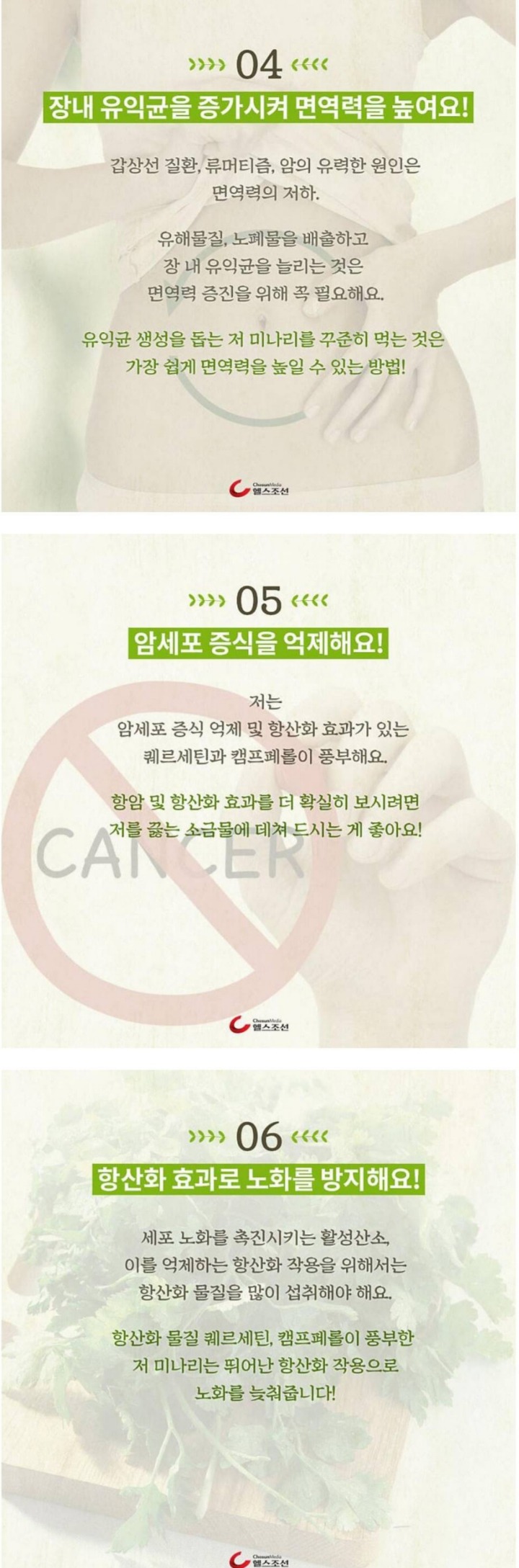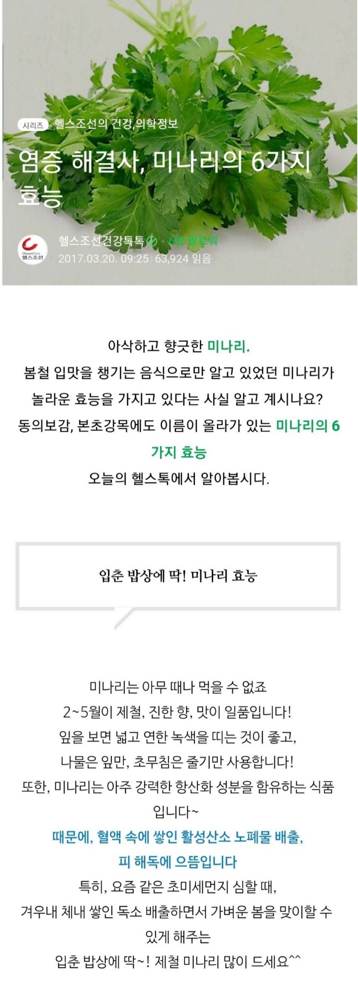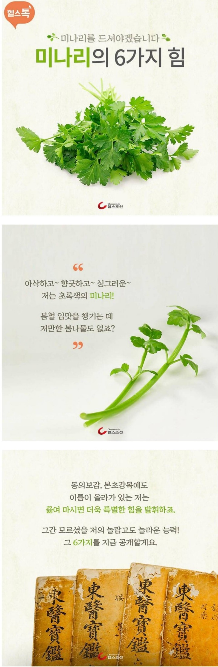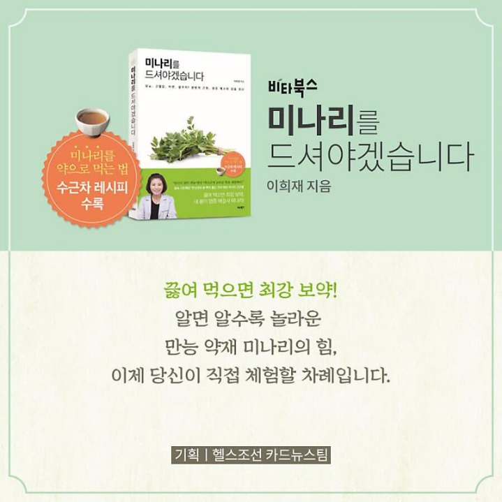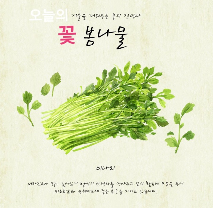 ✿❊내 용 : 우리나라 사람들의 식성에 잘 맞아 즐겨먹는 채소다. 데쳐서 나물은 물론 매운탕이나 다른 요리에 넣어 먹으며 아삭아삭한 맛은 자꾸 손이 가게 한다. 식용도 있지만 잎에 무늬가 들어있는 관상용 미나리도 있으며 실내외 수생정원에 잘 어울린다. 꽃이 한 여름에 피는데 흰색으로 모여 핀다.