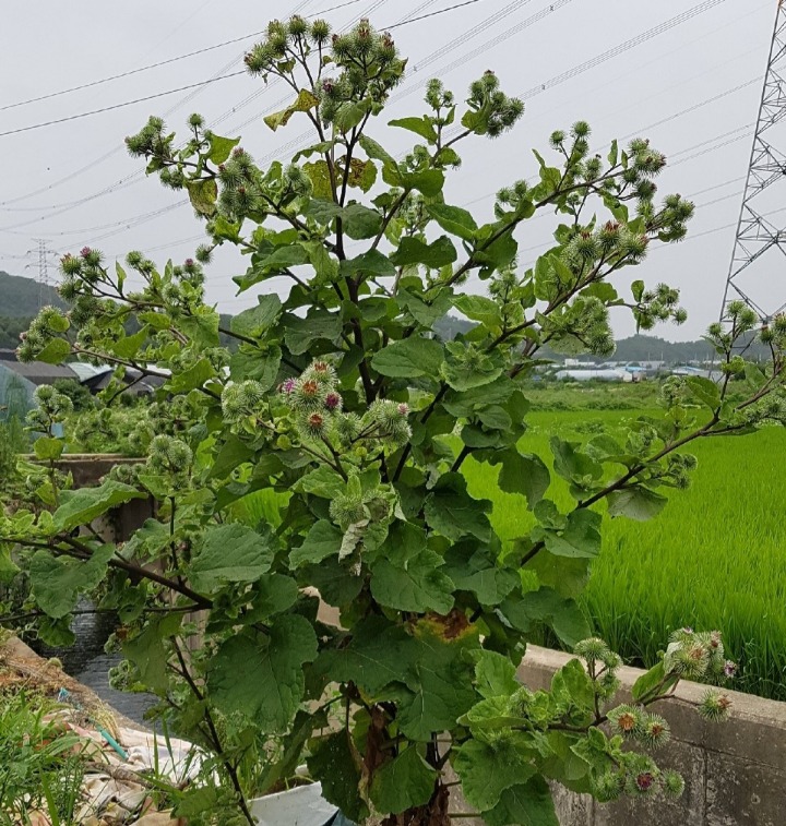 우리 배꼽 높이로 자란다. 전체 초형이 좀 엉성하지만 꽃은 엉겅퀴 비슷하게 존재감 있는 약용식물, 뿌리를 차로 만든 우엉차, 흔히 애용한다.