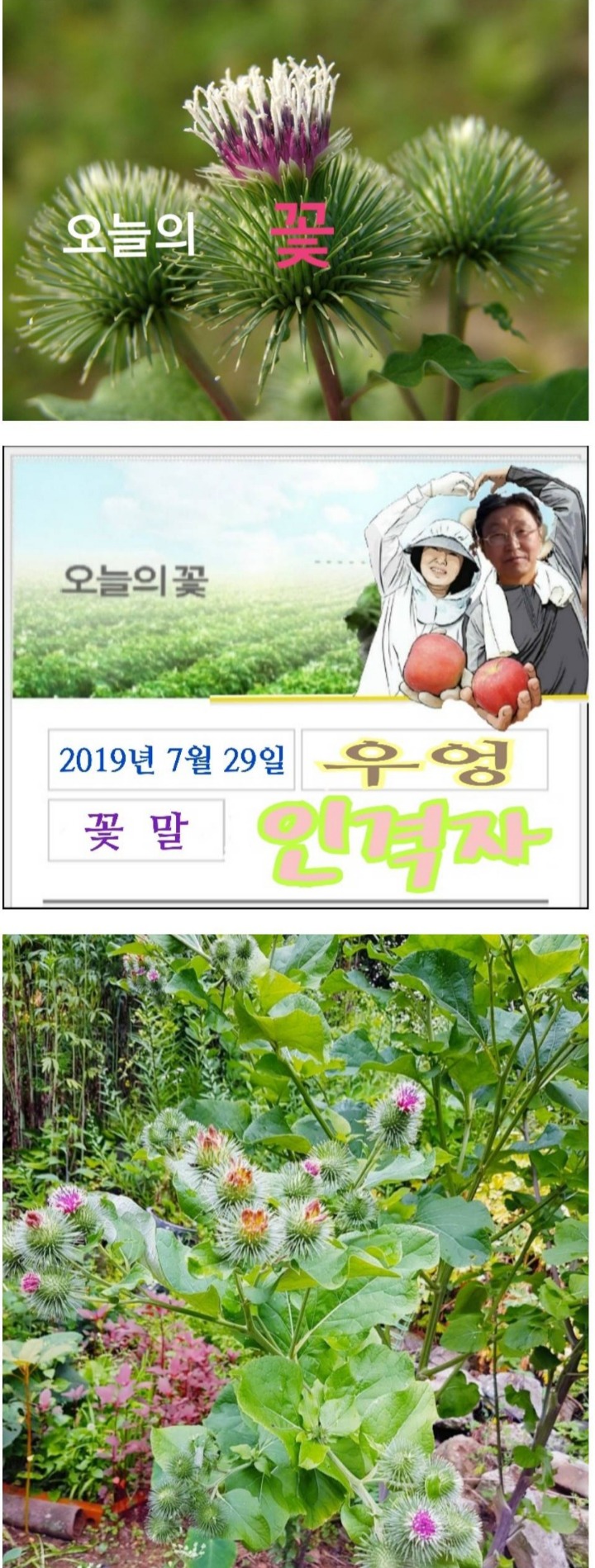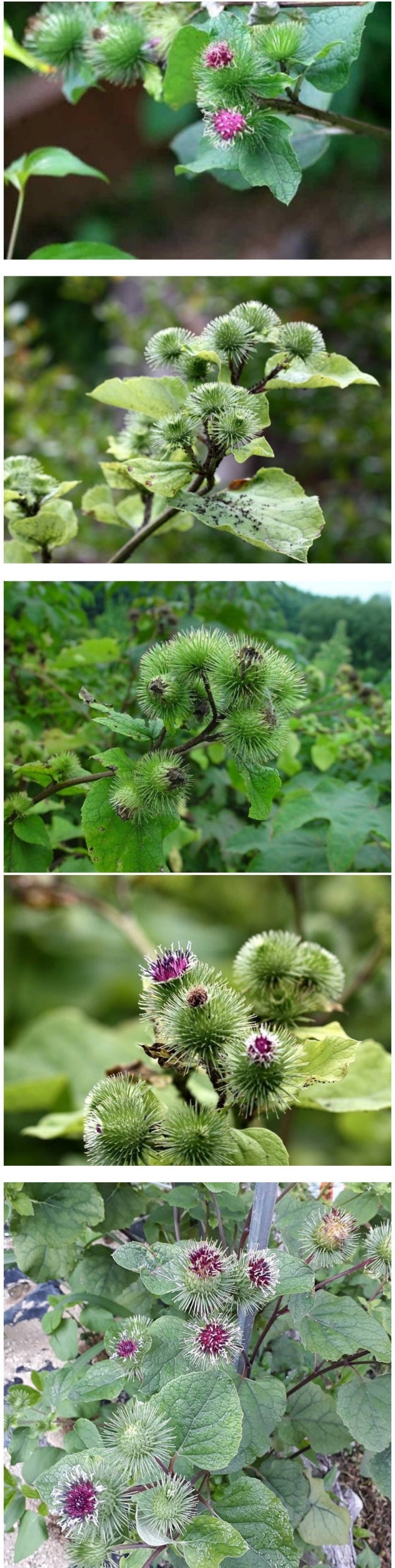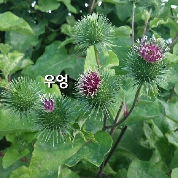 ✵✿내 용 : 꽃 모양이 특이해 종종 눈길을 끄는 식물이다. 주로 밭에서 뿌리를 식용하기 위해 기르는 채소다. 얼른 보면 꽃이 엉겅퀴를 닮은 것처럼 보이지만 진한 자주빛이 돌며 잎 모양도 전혀 다르다. 한자명은 牛蒡, 越年草이다.