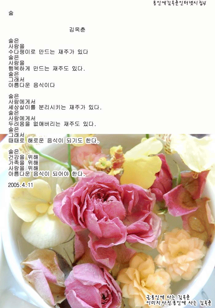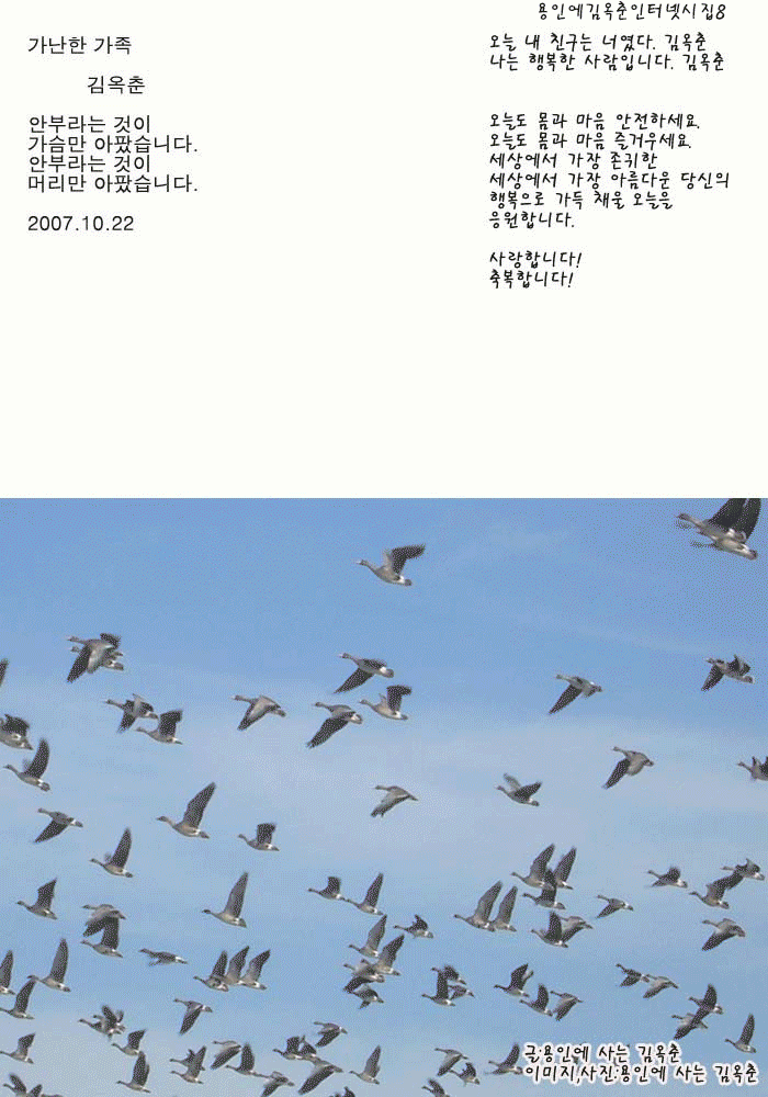 | 내 사랑아 김옥춘 고맙다. 참 고맙다. 사랑한다고 말할 수 있게 내게로 와줘서 사랑한다고 매일 말할 수 있게 내게로 와줘서 기쁘다. 참 기쁘다. 사랑스럽게 서로 안을 수 있는 너와 나여서 사랑스럽게 매일 안을 수 있는 너와 나여서 행복하다. 참 행복하다. 사랑할 수 있는 나여서 사랑할 수밖에 없는 너여서 매일 사랑할 수 있는 나여서 매일 사랑할 수밖에 없는 너여서 사랑한다. 참 많이 사랑한다. 사랑하고 싶다. 오래오래 사랑하고 싶다. 평생 사랑하고도 더 사랑하고 싶다. 2008.9.1 | 나의 소원 김옥춘 내 소원 이루어지는 날은 어제였어요. 오늘이었어요. 몰랐어요. 내 소원 이루고 살았다는 것을 내 소원 다 이루고 살았다는 것을 나 행복하게 되는 날은 어제였어요. 오늘이었어요. 몰랐어요. 나 행복했다는 것을 나 너무나 행복했다는 것을 쓰고 남을 돈으로 맛있는 것도 먹고 쓰고 남을 돈으로 여행도 다니고 쓰고 남을 돈으로 예쁜 옷도 사 입고 쓰고 남을 돈으로 월세 걱정 없이 살아보고 쓰고 남을 돈으로 좋은 일도 해보고 그게 내 소원이었는데 가난하지 않게 살아보는 것 풍요롭게 살아보는 것 그것이 내 소원이었는데 발톱 빠졌다가 이상하게 나고 손가락 다쳐보니 손톱 빠지지 않는 게 내 소원이 되었어요. 배 아팠던 날 배 아프지 않은 게 내 소원이 되었던 것처럼 그래요 난 너무나 행복한 사람이었어요. 지금의 소원 다 이루고 산 아름다운 삶이었어요. 평범한 하루를 얼마나 감사해야 하는지 오늘 하루를 얼마나 감사해야 하는지 지금의 내가 얼마나 사랑스러운지 알아요. 이제는 내 소원 이루어진 날은 어제였어요. 오늘이었어요. 알아요. 이제는 내 소원 다 이루고 살았다는 것을 나 행복한 날은 어제였어요. 오늘이었어요. 알아요. 이제는 나 너무나 행복하다는 것을 2008.8.28 |